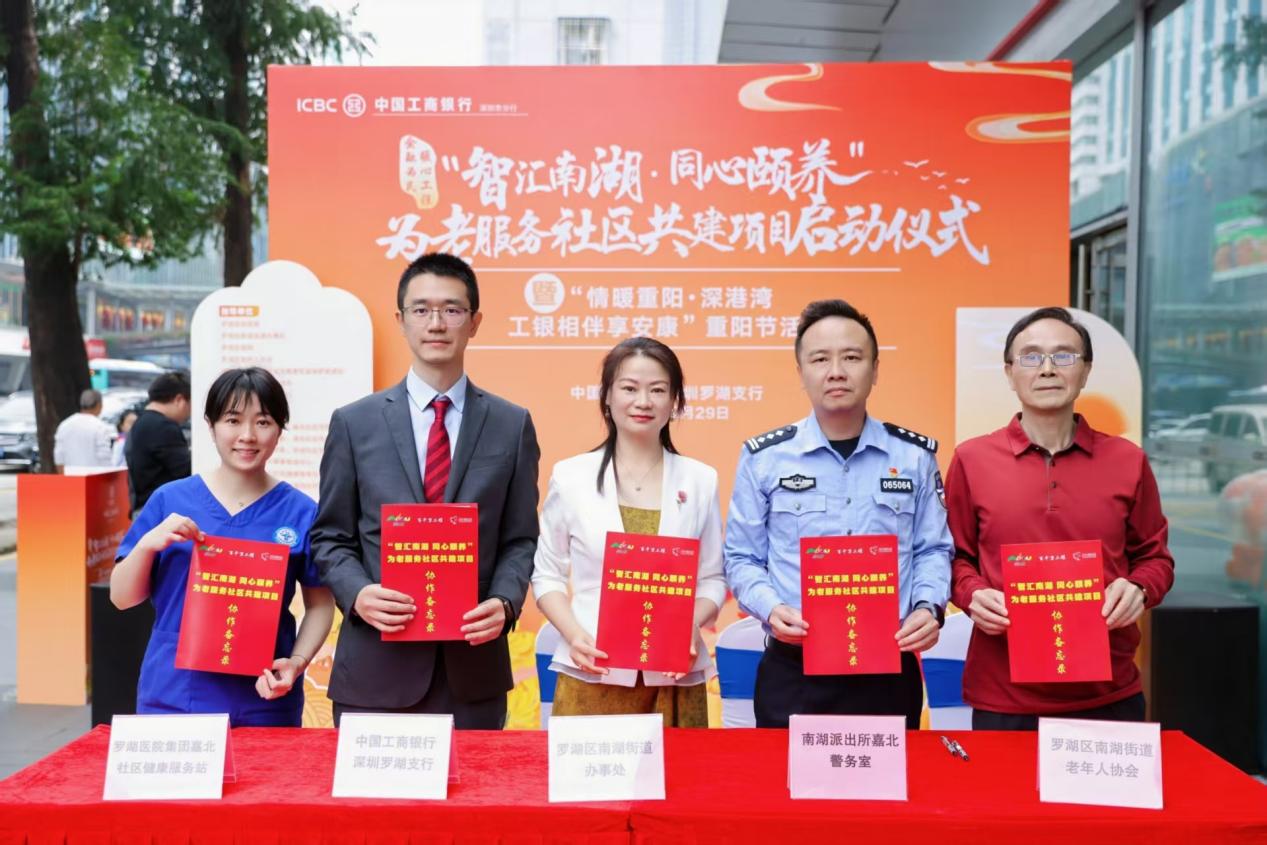 工商银行总行级养老金融旗舰网点的深圳罗湖支行,在重阳节当天举办了“情暖重阳·深港湾工银相伴享安康”活动,通过联动辖内网点及湖景社区党群服务中心、周边小区等户外场地,打造了一场覆盖全域、多方联动的敬老盛宴。在罗湖区民政、区残联、区老年人协会及南湖街道等多家政府、社区和机构指导与协办下,现场签约启动了“‘智汇南湖·同心颐养’为老服务社区共建项目”,标志着工商银行罗湖支行与街道、老年协会、社康中心等正式建立“资源共享、优势互补、协同联动”的长效合作机制,共同致力于构建“金融+社区+医疗”三位一体的养老金融社区服务新标杆。