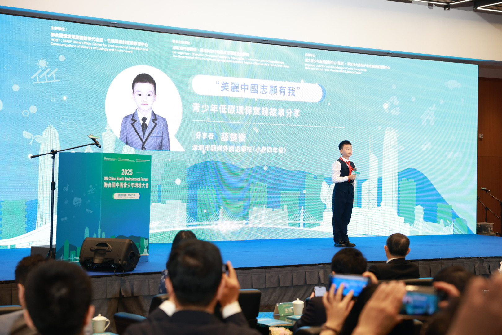 当天,“美丽中国,零碳行动”2025年联合国中国青少年环境大会在香港举办。在“美丽中国,志愿有我”低碳环保实践分享环节,深圳市龙岗外国语学校四年级学生薛楚衡作为深圳代表登台,以《从深圳出发,守护蓝色星球》为主题,生动讲述了塑料瓶的“重生之旅”。