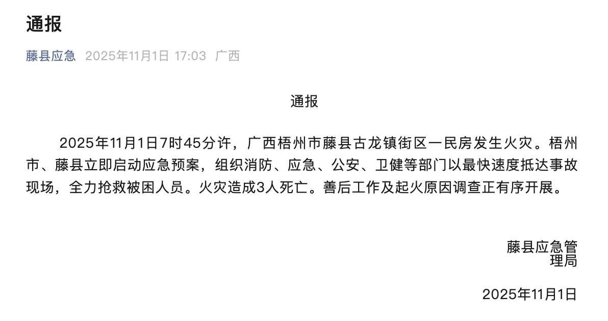2025年11月1日7时45分许,广西梧州市藤县古龙镇街区一民房发生火灾。梧州市、藤县立即启动应急预案,组织消防、应急、公安、卫健等部门以最快速度抵达事故现场,全力抢救被困人员。火灾造成3人死亡。善后工作及起火原因调查正有序开展。