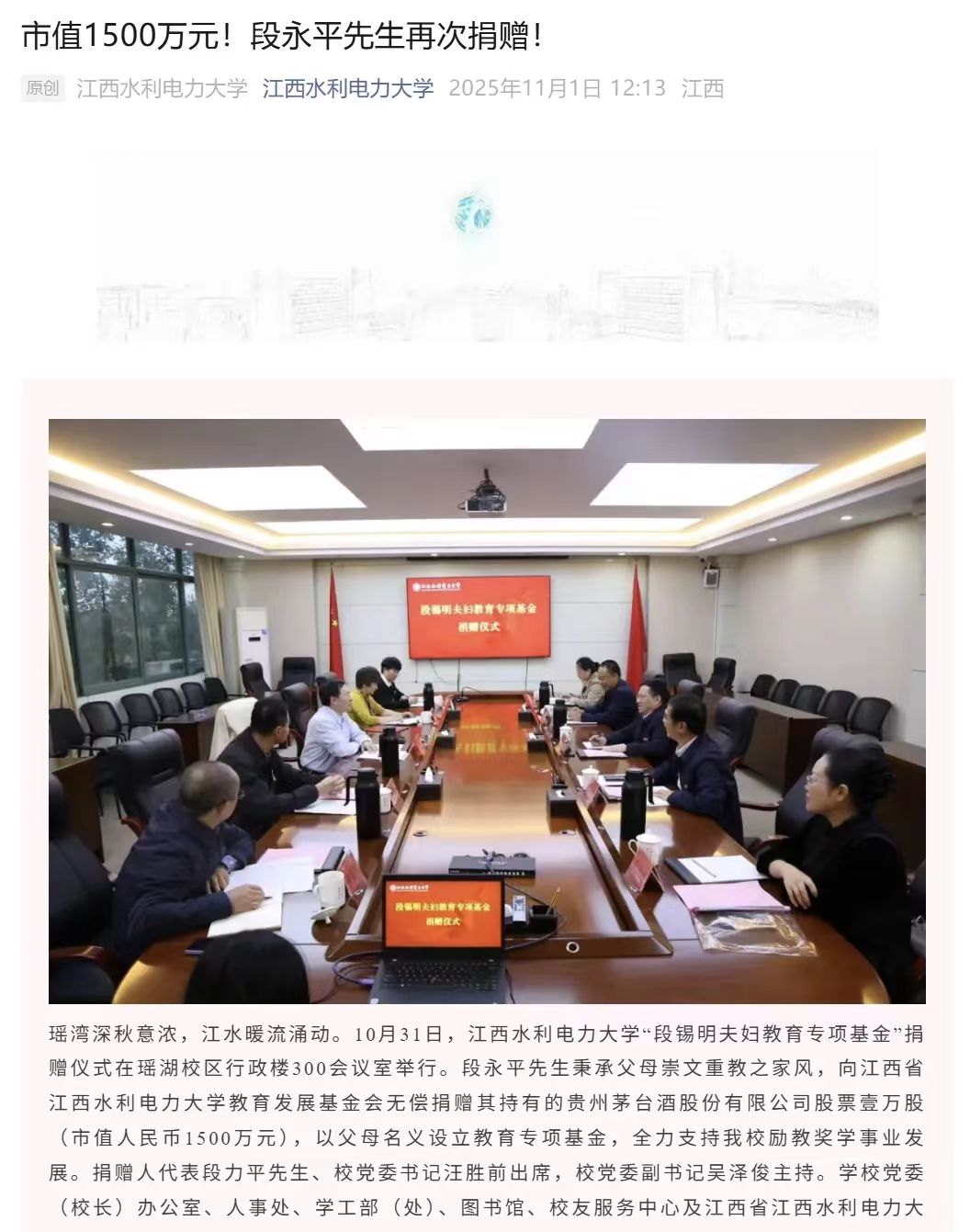 投资大佬段永平向江西省江西水利电力大学教育发展基金会无偿捐赠其持有的贵州茅台酒股份有限公司股票壹万股(市值人民币1500万元),以父母名义设立教育专项基金,全力支持该校励教奖学事业发展。