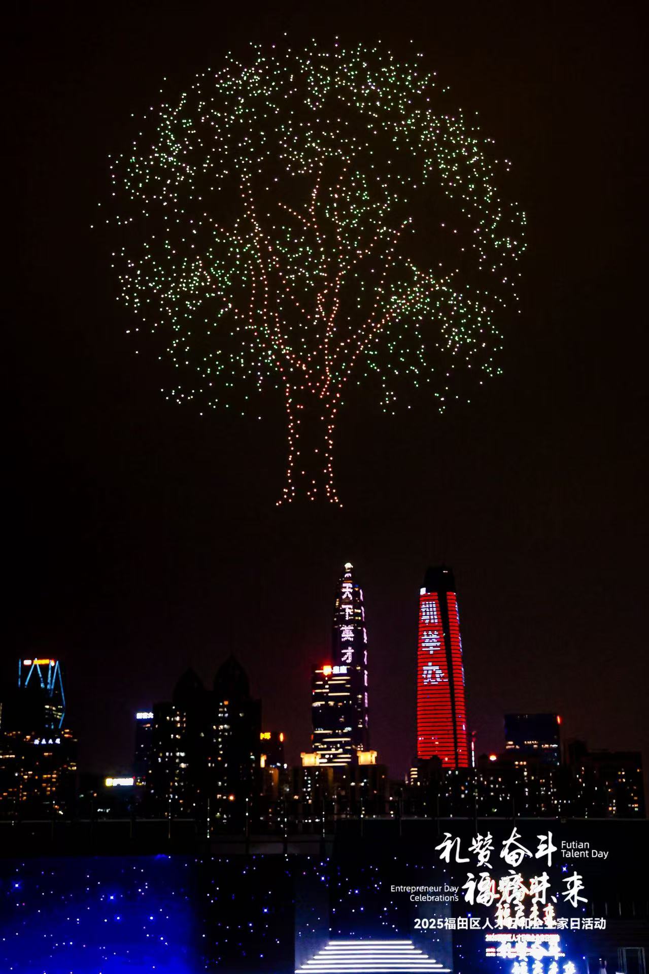 2025架无人机腾空而起,以天为幕,以光为笔,用科技之光、艺术之美,依次绘就震撼人心的十二个篇章。十二个动人篇章,在夜空中流转,每一束光,都是一个奋斗的故事;每一个图案,都是一份对未来的期盼。“礼赞奋斗,福启未来”。