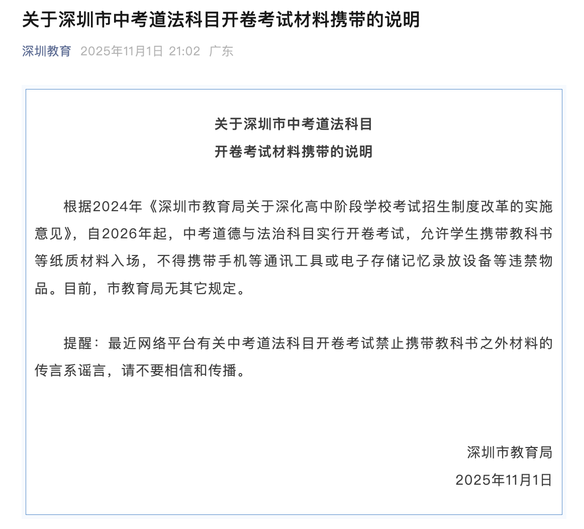 11月1日晚,“深圳教育”微信公众号发布《关于深圳市中考道法科目开卷考试材料携带的说明》。