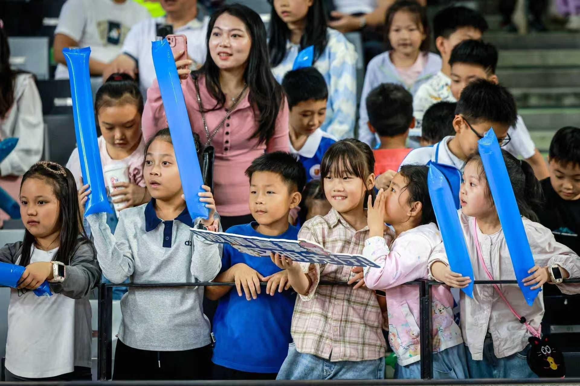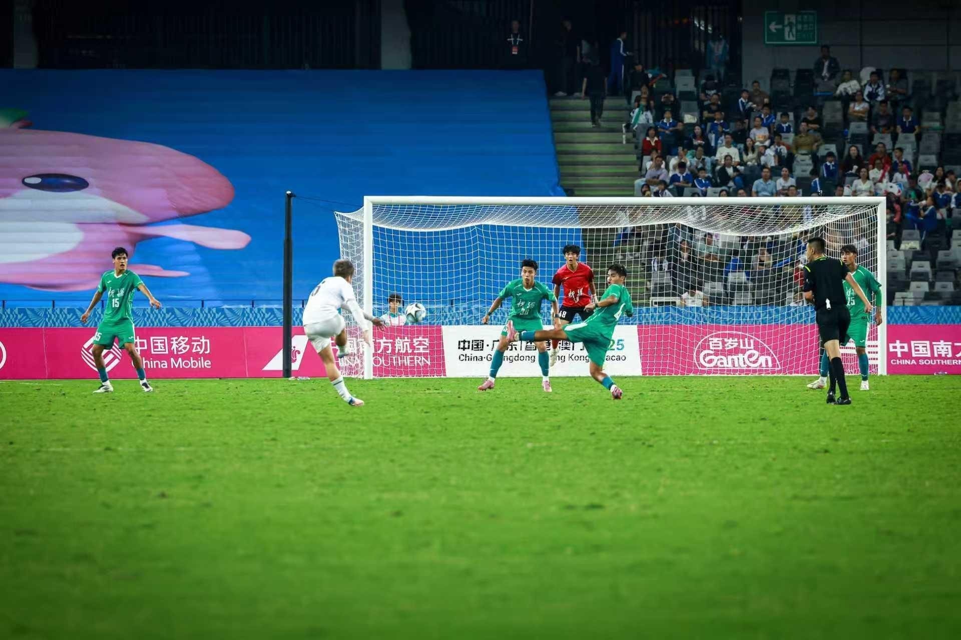 当晚的大运中心体育场,不仅有赛场上的精彩对决,场内外的全运氛围同样浓厚。场馆外的电子屏滚动播放着大赛标语,赛前响起的粤语版十五运会会歌,让现场观众感受到主场的独特温度;中场休息时,吉祥物“喜洋洋”“乐融融”蹦跳着与观众互动,让小朋友们振奋不已,欢呼声与笑声交织。