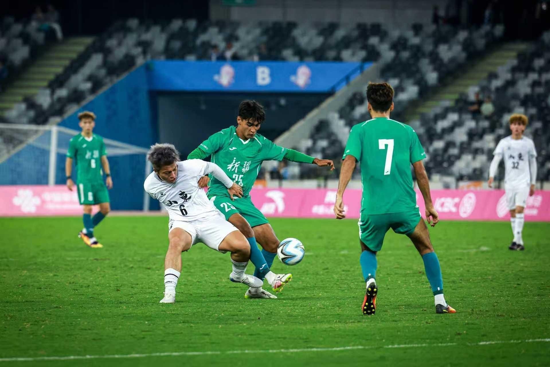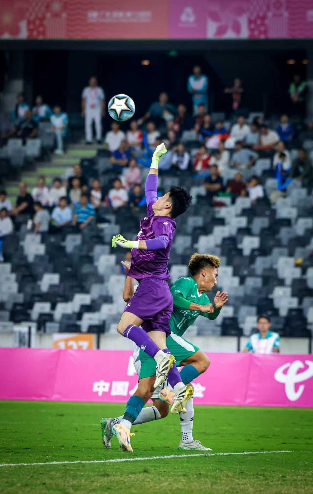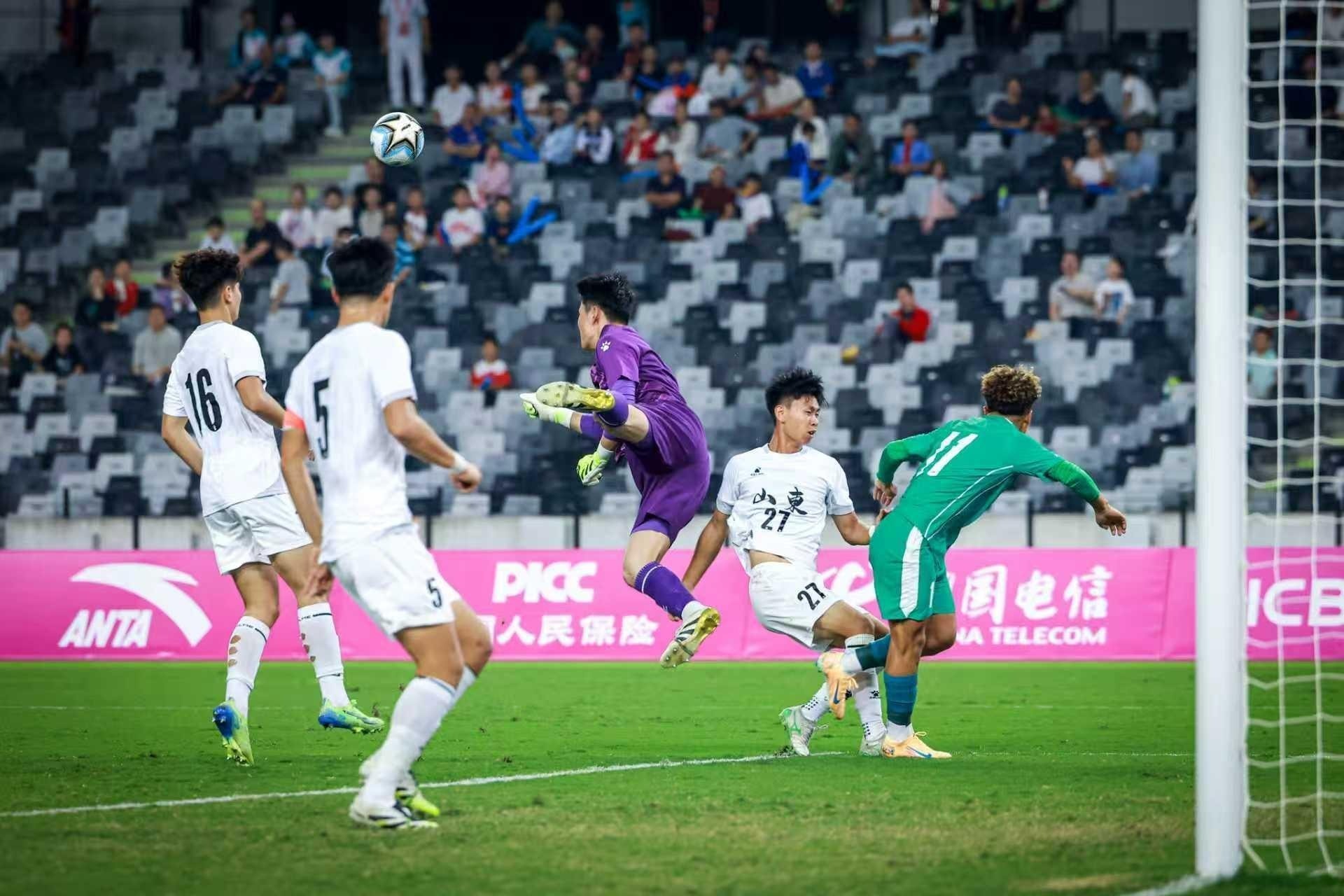 面对落后的比分,新疆队发起猛烈反扑。第72分钟,新疆队打出精彩防守反击,一记远射抽出,皮球直奔球门死角,现场观众惊呼之际,山东队门将飞身扑下,将球稳稳抱住,上演“神级扑救”。此后,新疆队虽持续施压,但山东队通过严密防守与控球战术稳住节奏,最终将2:1的比分保持到终场,拿下胜果。