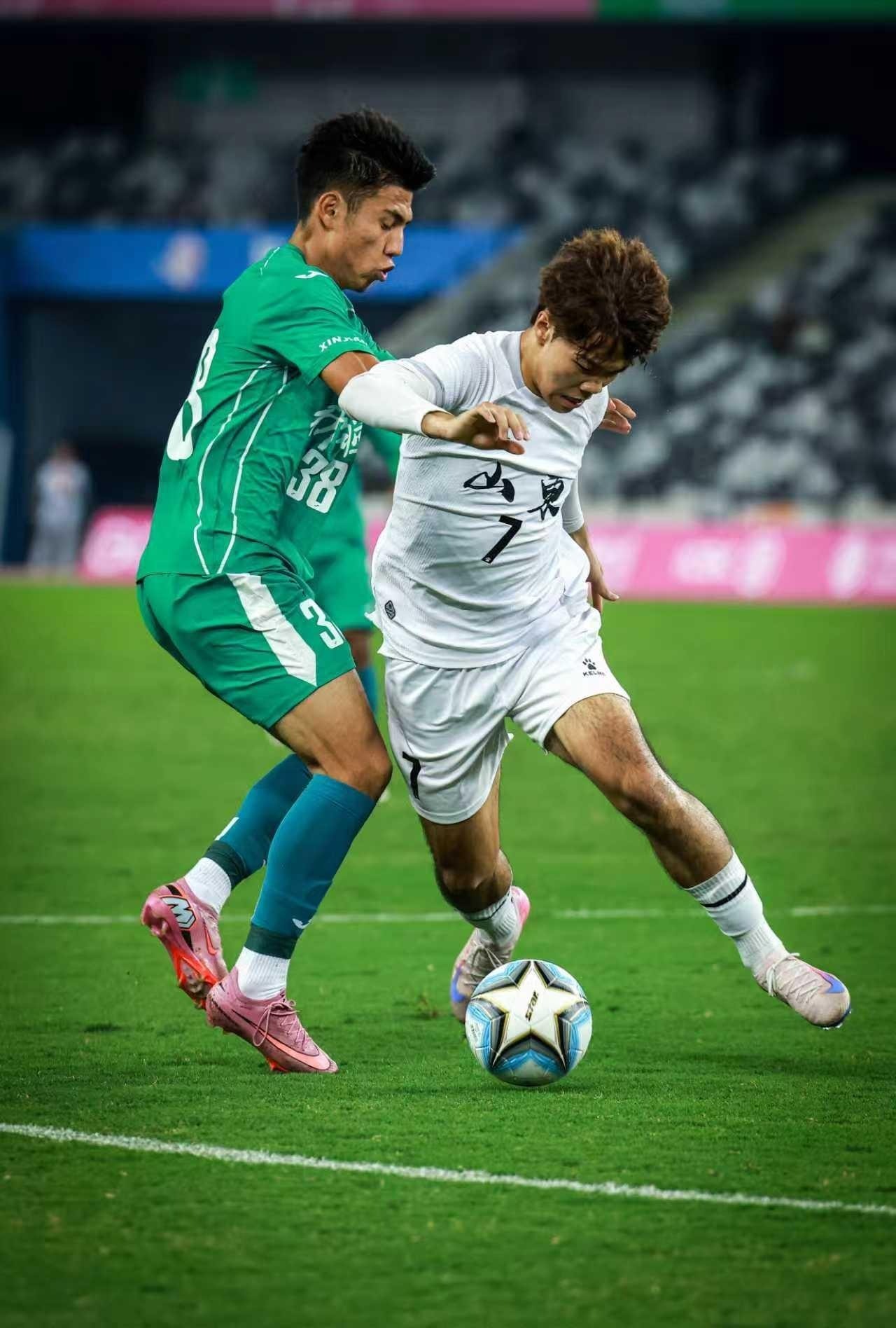 落后的山东队并未慌乱,教练组在场边迅速调整战术,球员们加快进攻节奏,不断向新疆队防线施压。上半场补时阶段,转机终于到来。山东队前锋在新疆队禁区内被绊倒,主裁判果断判罚点球。5号彭啸挺身而出,助跑、推射一气呵成,皮球直入球门右下角,1:1!这位2025赛季中乙联赛中单月打入4球并包揽最佳球员与最佳年轻球员奖项的小将,用一记精准点球展现“关键先生”的定力,山东球迷看台瞬间爆发出震天呐喊。