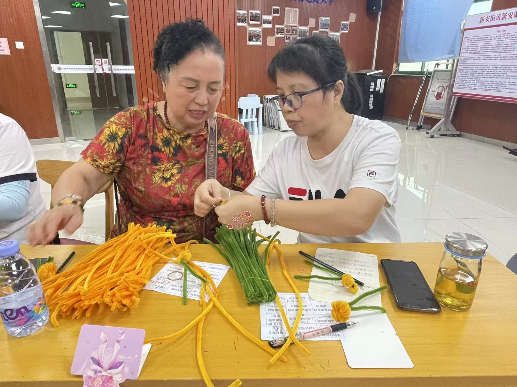 随后的手工环节,来自区妇联的黄玲玲老师手把手指导。义工们握着橙黄、翠绿的扭扭棒,剪、折、拼、接,不一会儿,一个个饱满的“柿子”便成型。有人为“果实”添上叶脉,有人给“枝叶”捏出弧度,互相帮着调整细节,现场热闹又温馨——这“事事如意”的寓意,成了大家心照不宣的祝福。