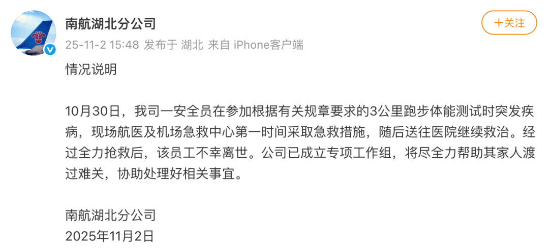 11月2日,南航湖北分公司发布情况说明称,10月30日,该公司一安全员在参加根据有关规章要求的3公里跑步体能测试时突发疾病,现场航医及机场急救中心第一时间采取急救措施,随后送往医院继续救治。经过全力抢救后,该员工不幸离世。