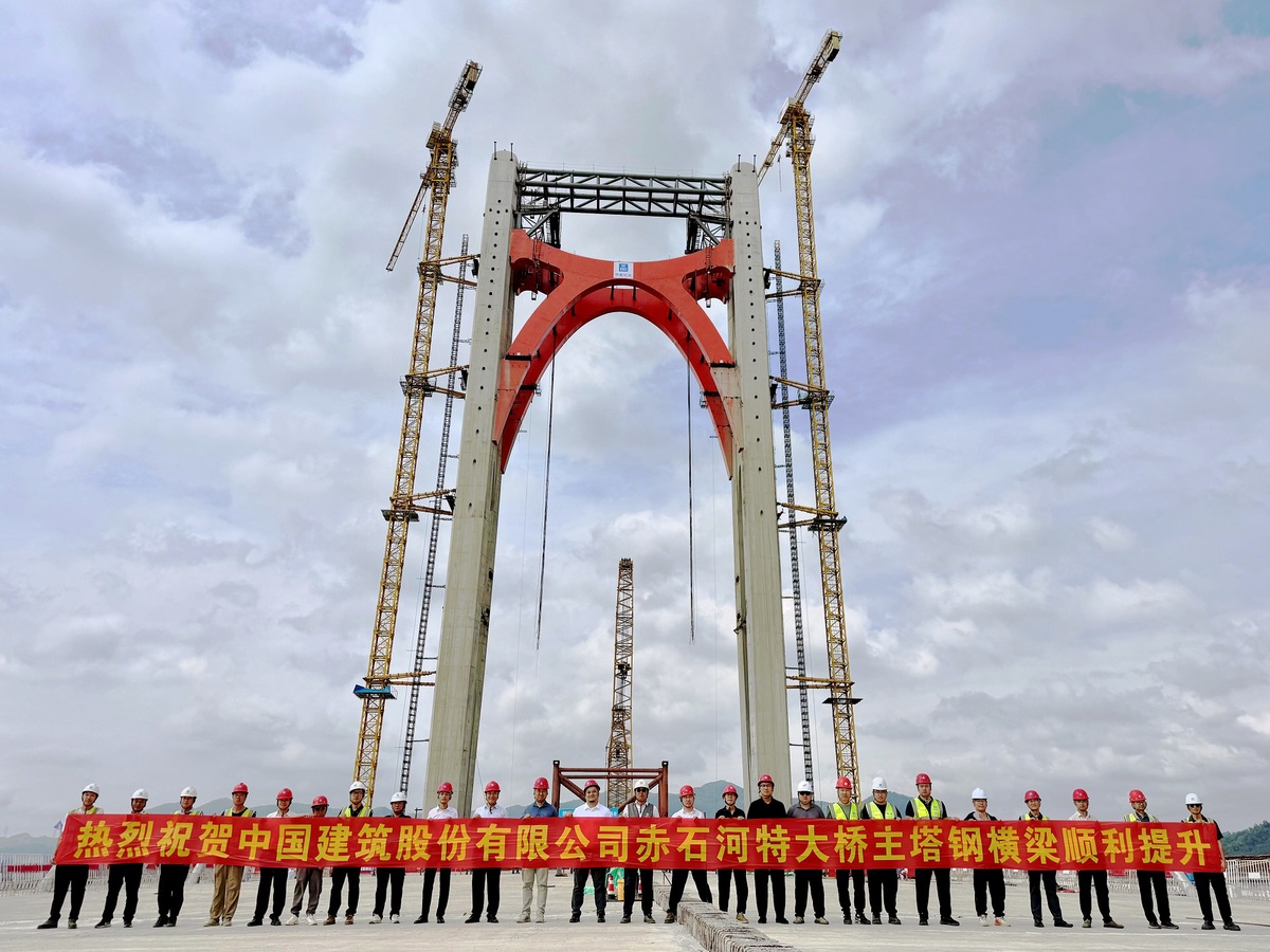 此次成功提升的钢横梁,是连接两座塔柱的关键“筋骨”,重达476吨,跨度36.5米。将其安全提升至预定高度,如同完成一次“百米高空穿针”,技术要求极高,是项目建设中的重要里程碑。赤石河特大桥全长1058米,采用造型现代的单塔双索面不对称斜拉桥设计,主塔高达111米,主跨达256米,建成后将成为合作区的标志性景观。