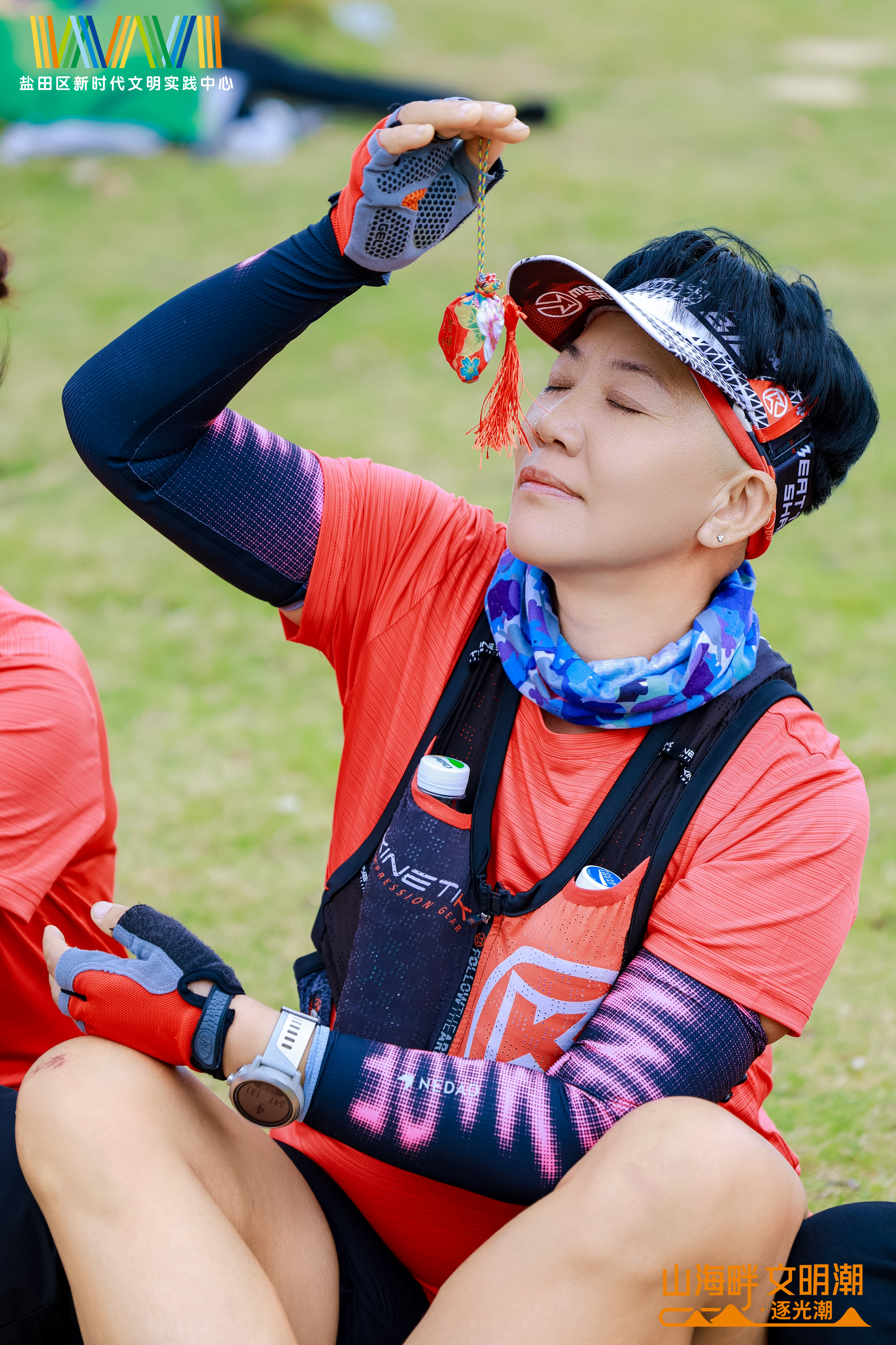 经过2个小时的徒步,众人登临梧桐亭,盐田港的壮阔海景与连绵山峦尽收眼底。主办方为每位参与者送上一枚茱萸香囊,祈福祛病,也寄托对长者健康长寿的祝愿。