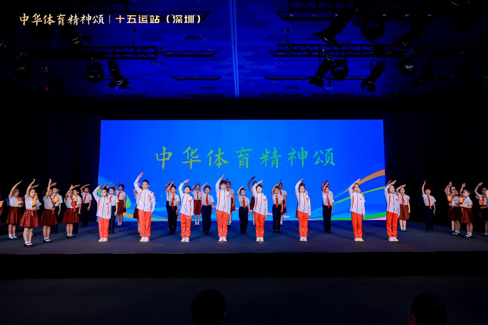 仪式现场,深圳市福田区荔园小学学生们手捧火炬,朗诵《中华体育精神颂》,展现了中华体育精神的薪火相传。