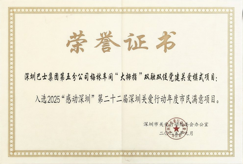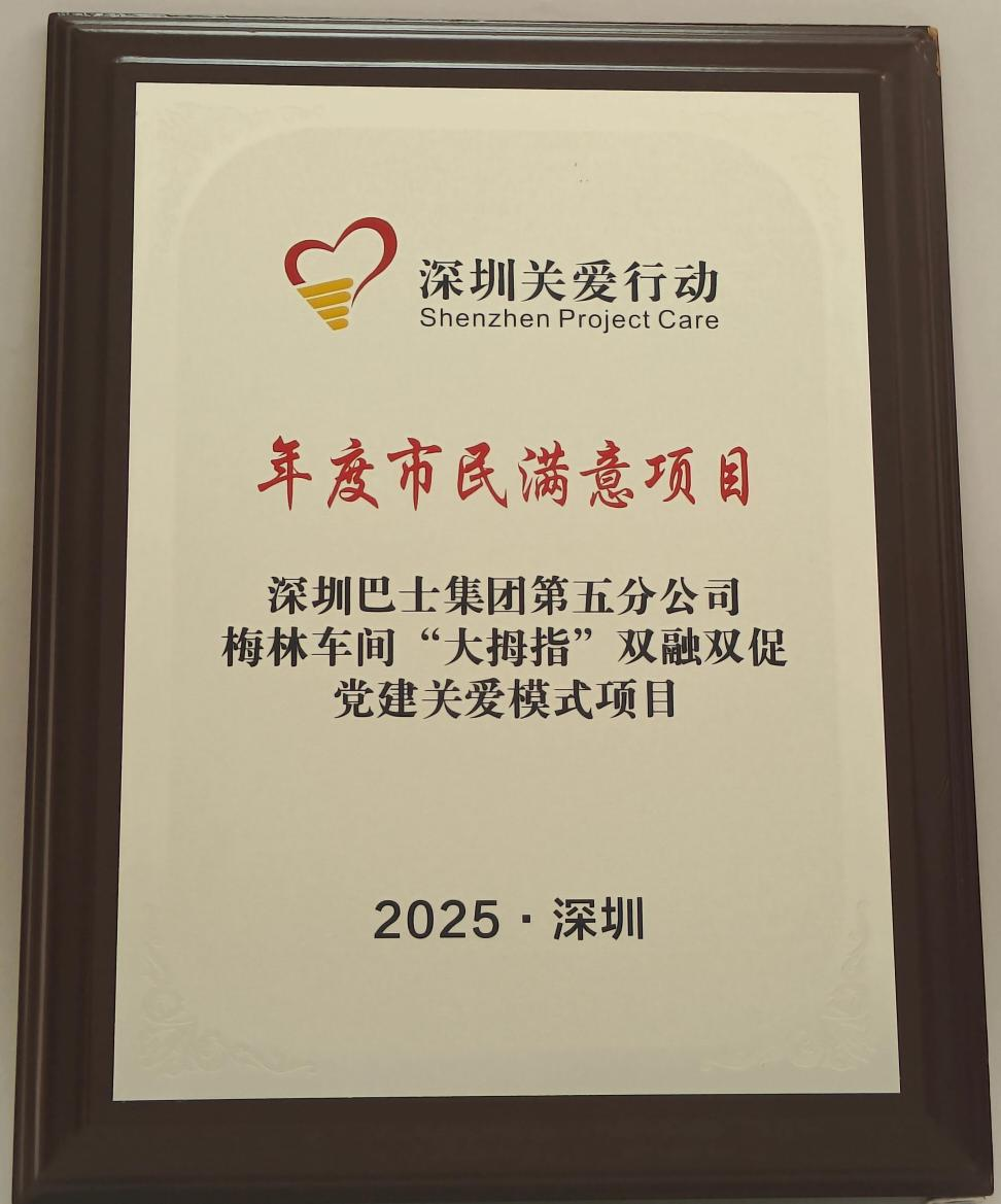 2025年10月31日,第二十二届深圳关爱行动“年度市民满意项目”颁奖活动在深圳书城举行。深圳巴士集团第五分公司梅林车间党支部“大拇指”双融双促党建关爱模式项目从众多参评项目中脱颖而出,荣获2025感动深圳“年度市民满意项目”殊荣。这份荣誉,不仅是对一个基层党建品牌七年坚守的至高礼赞,更是深圳这座“关爱之城”以党建引领民生服务的生动体现。