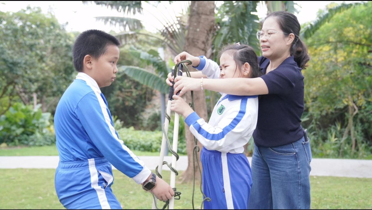 “老师说,野外遇到受伤的人,先保护自己再帮忙,但最重要的是稳稳托住对方。”四年级学生莫芷萱记得,打结时手要用力均匀,搬运时脚步要协调,“当我稳稳抬着同伴到安全区时,心里特别有成就感”。