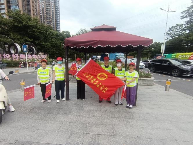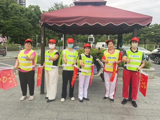 活动期间,1 名社区工作人员全程带队统筹,6 名长青志愿者组成的劝导小队分工协作,在路口关键位置开展文明引导工作:对闯红灯、乱穿马路、非机动车逆行等不文明交通行为进行温和劝阻,用通俗易懂的语言向居民讲解交通风险;同时借助音响设备循环播报交通安全知识,让居民在等候红绿灯的碎片化时间里轻松学习交通法规常识。老人们身着志愿马甲、手持引导小红旗坚守岗位的身影,成为路口一道温暖亮眼的风景线,也为十五运会营造了安全有序的交通环境。