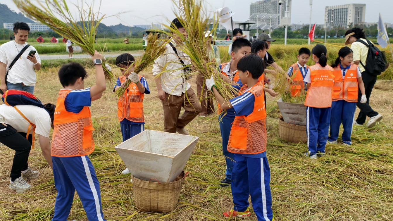 水稻收割成为践行“气候担当”的实战场。在农场工作人员的指导下,孩子们戴上手套,手握小镰刀,学着家长的样子弯腰割稻。金黄的稻田里,亲子身影交错忙碌,汗珠滴落却笑容灿烂。
