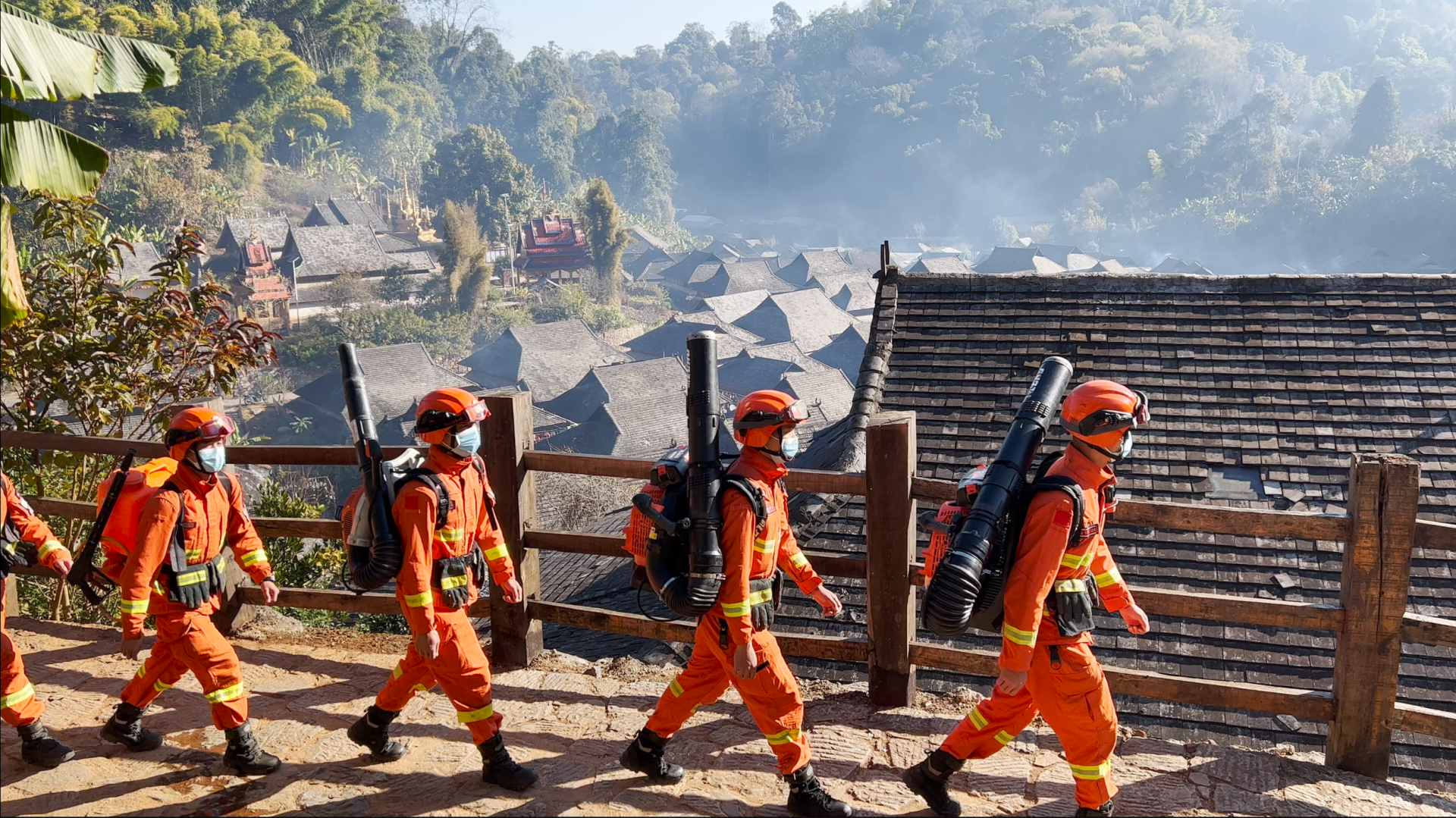 指战员在景迈山少数民族村寨开展携装森林防火巡护