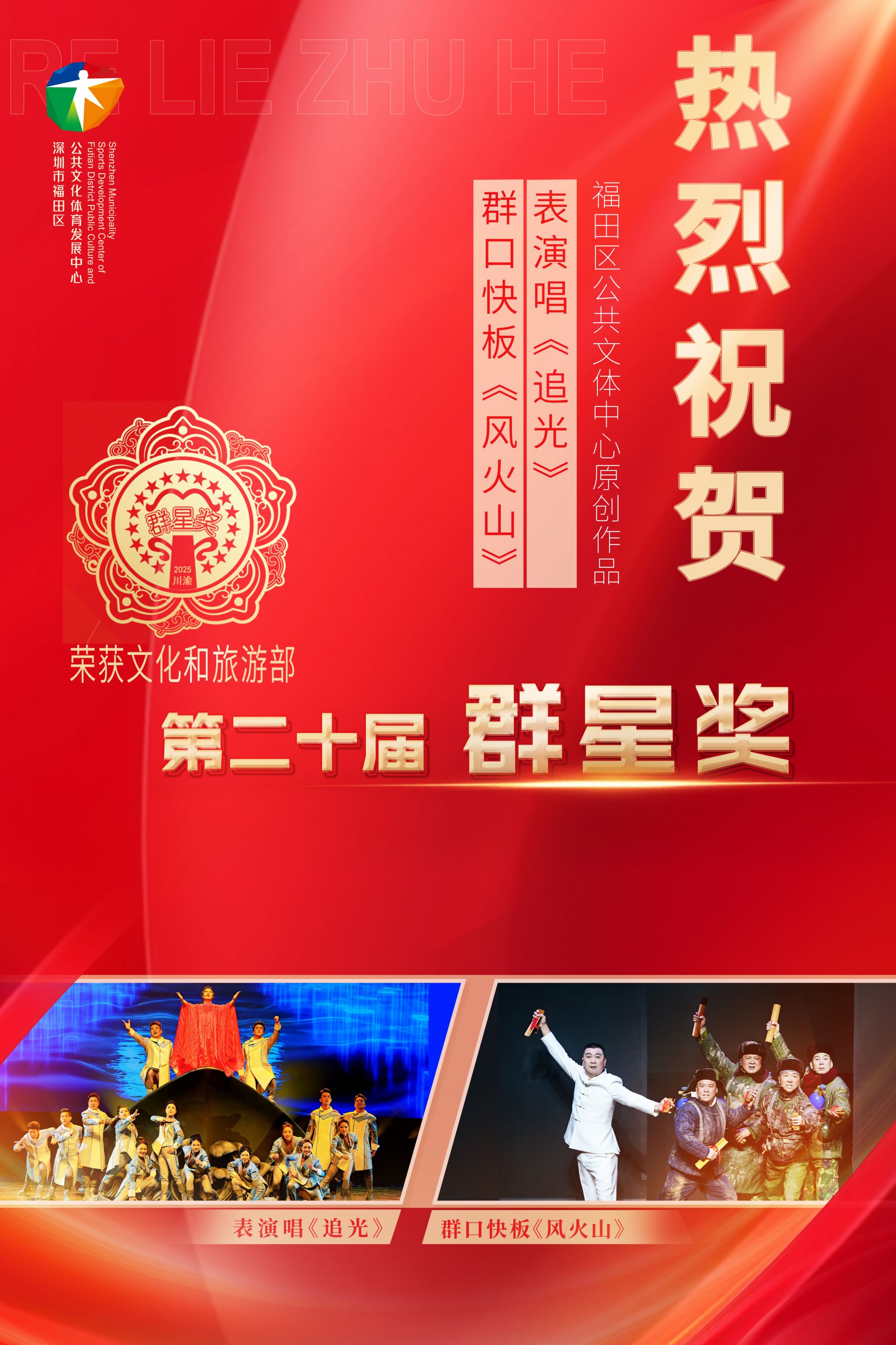 金秋送爽,硕果盈枝。11月4日,第二十届全国 “群星奖” 评选结果揭晓。这一我国群众文化领域的最高奖项,再次为全国群众文艺作品创作划定 “标杆”。深圳市福田区创作的表演唱《追光》与群口快板《风火山》不负众望、双双夺魁,以“双子星”之姿在全国舞台绽放“福田光彩”,不仅实现了福田群众文艺发展的历史性突破,更成为深圳建设“文化创新之都”的生动注脚。