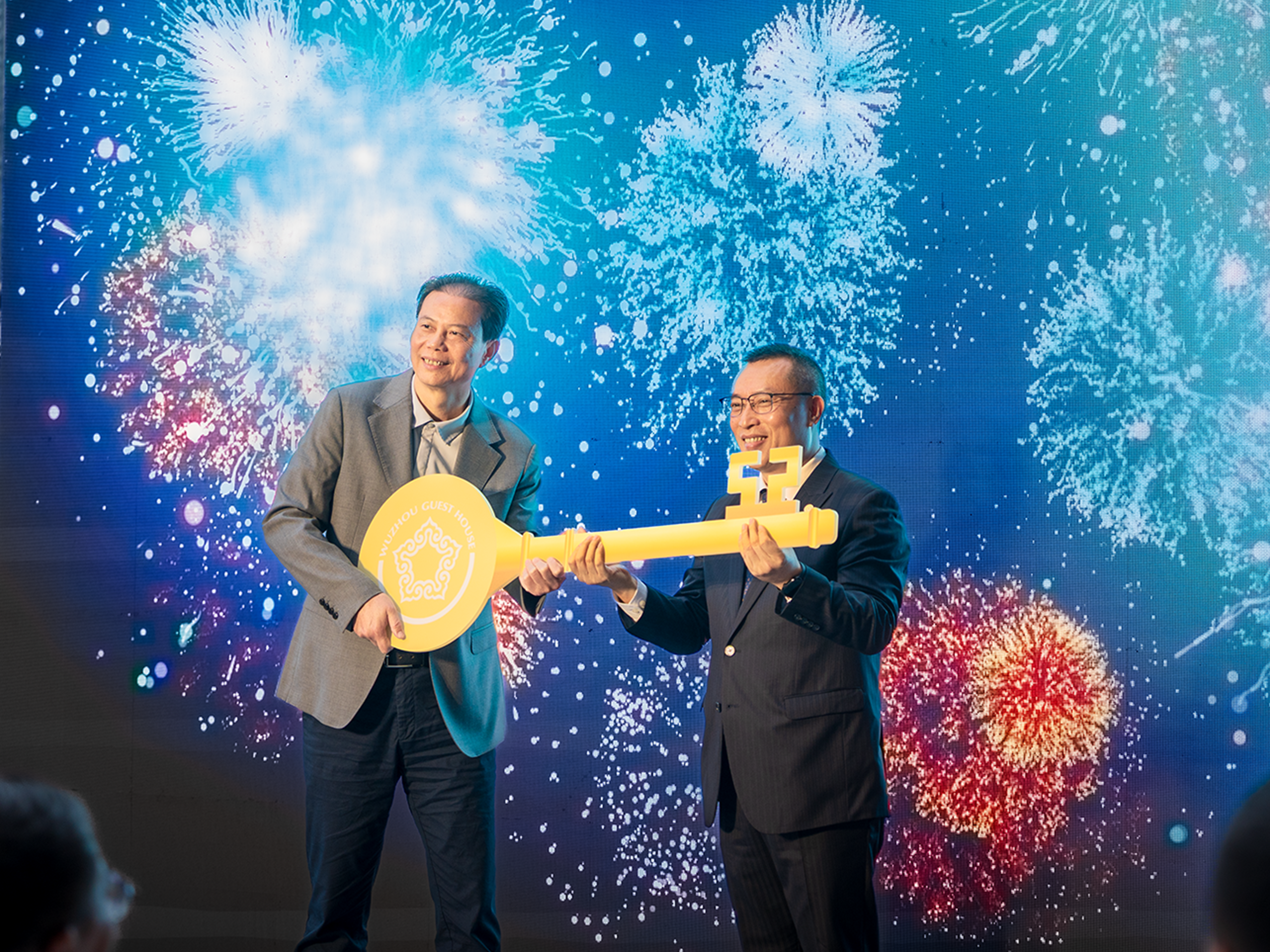 在开业仪式上,深圳体育产业集团总经理林养植将象征开启运营的金钥匙交付给五洲体育中心酒店总经理范树雄,标志着酒店正式投入运营。