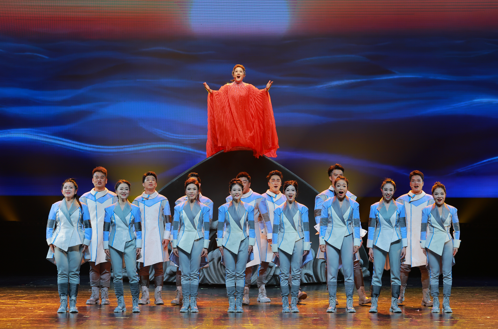 舞台视觉同样彰显匠心,体现深圳特色。特别设计的船头造型,呼应“永立潮头”的时代精神;灯光设计上,开场聚光灯突出叙事性,中段蓝色调呼应海洋元素与BLues(蓝调)音乐,结尾的蓝色主基调则象征着梦想的无限延伸;演员服装则采用高科技面料,体现深圳科创之城定位,而结尾以一袭红裙点题,代表党和国家的引领,寓意每个人都是一束光,进一步升华了作品立意。