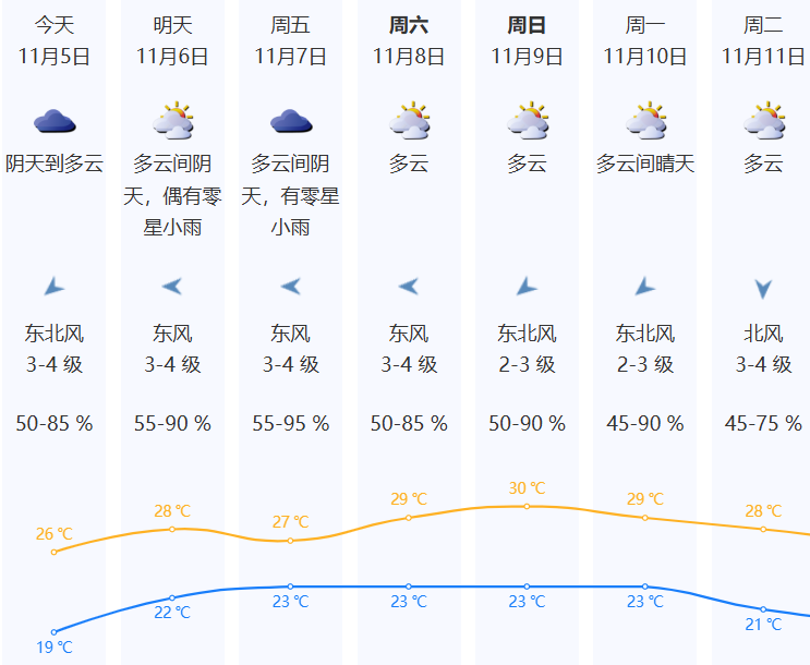 预计11月5日早晨6-9时,阴天;气温19~21℃;东北风3-4级,沿海、高地和海区阵风6~7级;相对湿度75%~85%;能见度普遍10~20公里。