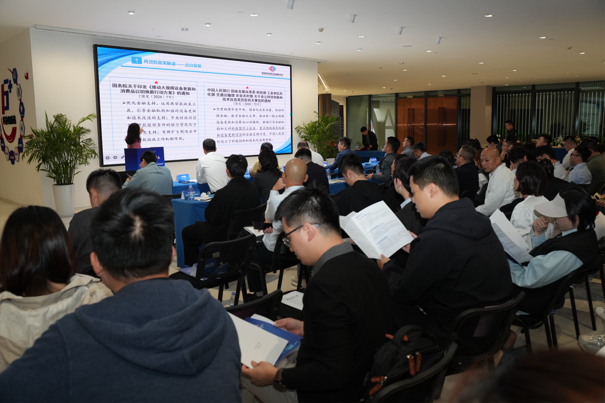 随后,活动进入核心政策解读环节。深圳市宝安区企业服务中心政策讲师受邀对“科技创新和技术改造再贷款政策”进行了权威且细致的梳理。她深入阐释了该项由国家层面推出的重要金融工具的设立背景、政策内容、核心价值与深远意义,并重点围绕申请条件、支持范围、操作流程等企业关切的实际问题逐一进行分析讲解,为企业高效申请政策指明了方向,现场反响十分热烈。