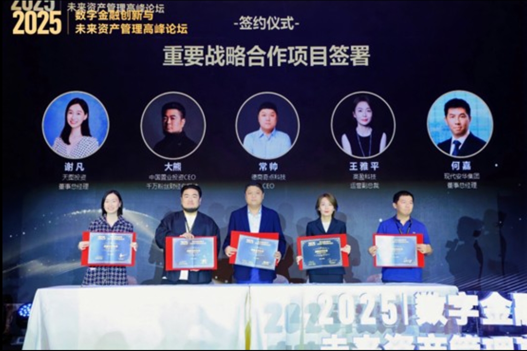 论坛的高潮之一是重要的战略合作签约仪式。在全体嘉宾的见证下,德商奇点科技CEO常帅、天图投资董事总经理谢凡、现代安华集团董事总经理何嘉、高盈科技运营副总裁王雅平、中国置业投资CEO 千万粉丝财经自媒体大熊共同签署了合作协议。此举标志着各方将展开深度合作,强强联合,共同拓展数字金融的生态边界。