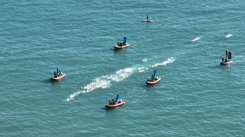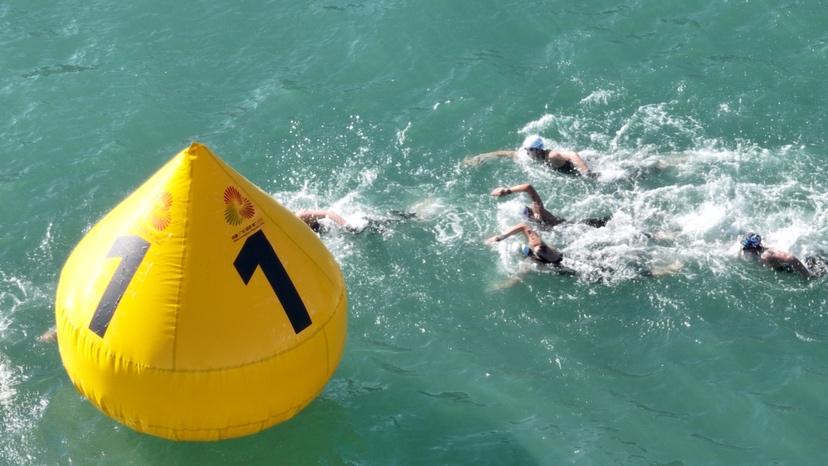 海上马拉松没有清晰的水道线,运动员需通过“抬头看方向”来观察前方的浮标、引导船或岸上标志物来修正游进方向,极其考验运动员的直线导航能力。
