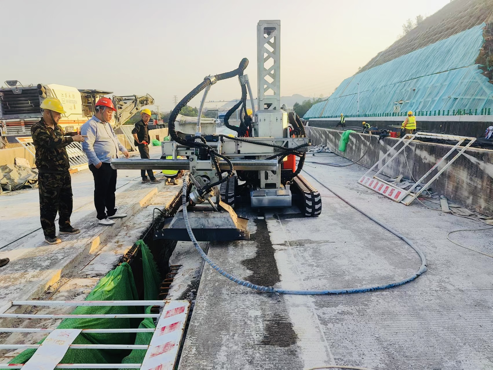 这场大型“合体手术”怎么做?施工前,建设团队运用水射流切割法精准“开刀”,凿除翼缘板混凝土,完整展现原有钢筋结构,为旧桥拼合创造有利条件。随后植入加密钢筋,实现桥梁初步“牵手”,形成受力连接的关键部位。