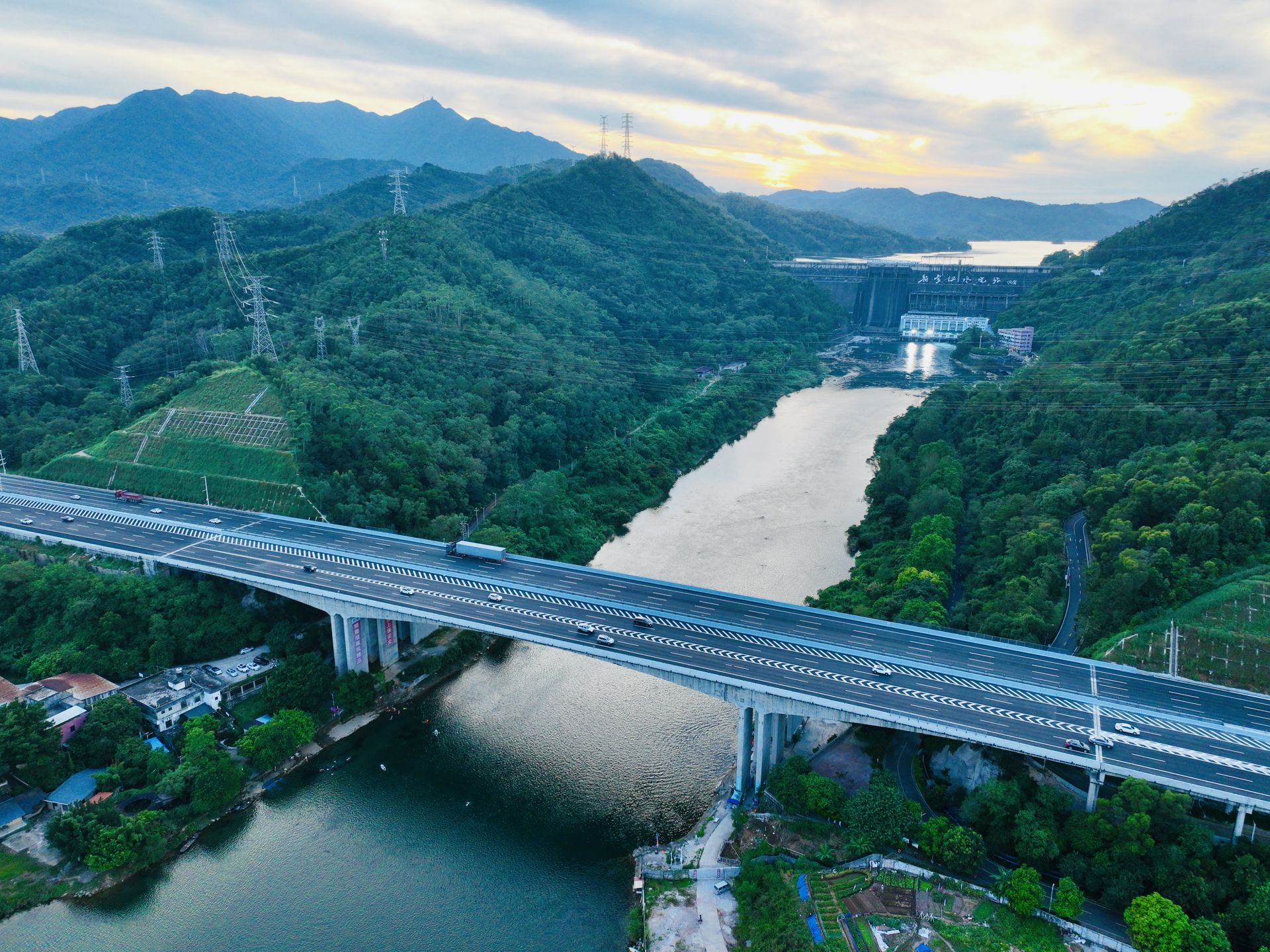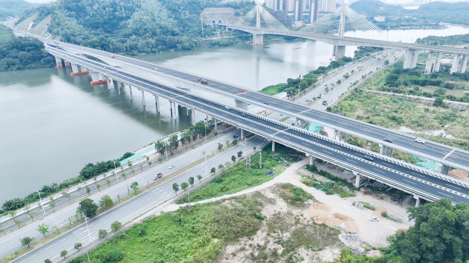 新丰江大桥和东江大桥是项目控制性工程,长度分别约为291米(主跨130米连续刚构)和799.7米(主跨80米连续箱梁),均由四车道扩建至八车道。桥梁大跨径拼接技术在这两项工程得以成功应用,实现了旧桥部分整体横向拼接,攻克了大跨径混凝土连续箱梁在旧桥改扩建中的核心难题。其中,新丰江大桥旧桥拼接工程成为国内大跨径连续刚构桥横向拼接的先例,为同类工程升级改造提供了新路径。