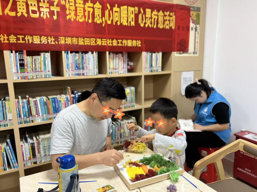 近日,西乡街道“多彩西乡,让爱无碍”困境儿童社会融入支持项目开展“绿意疗愈·心向暖阳”亲子园艺心灵疗愈活动。45组家庭在专业老师带领下,通过苔藓画制作体验自然的疗愈力量,在协作创作中增进亲子情感。