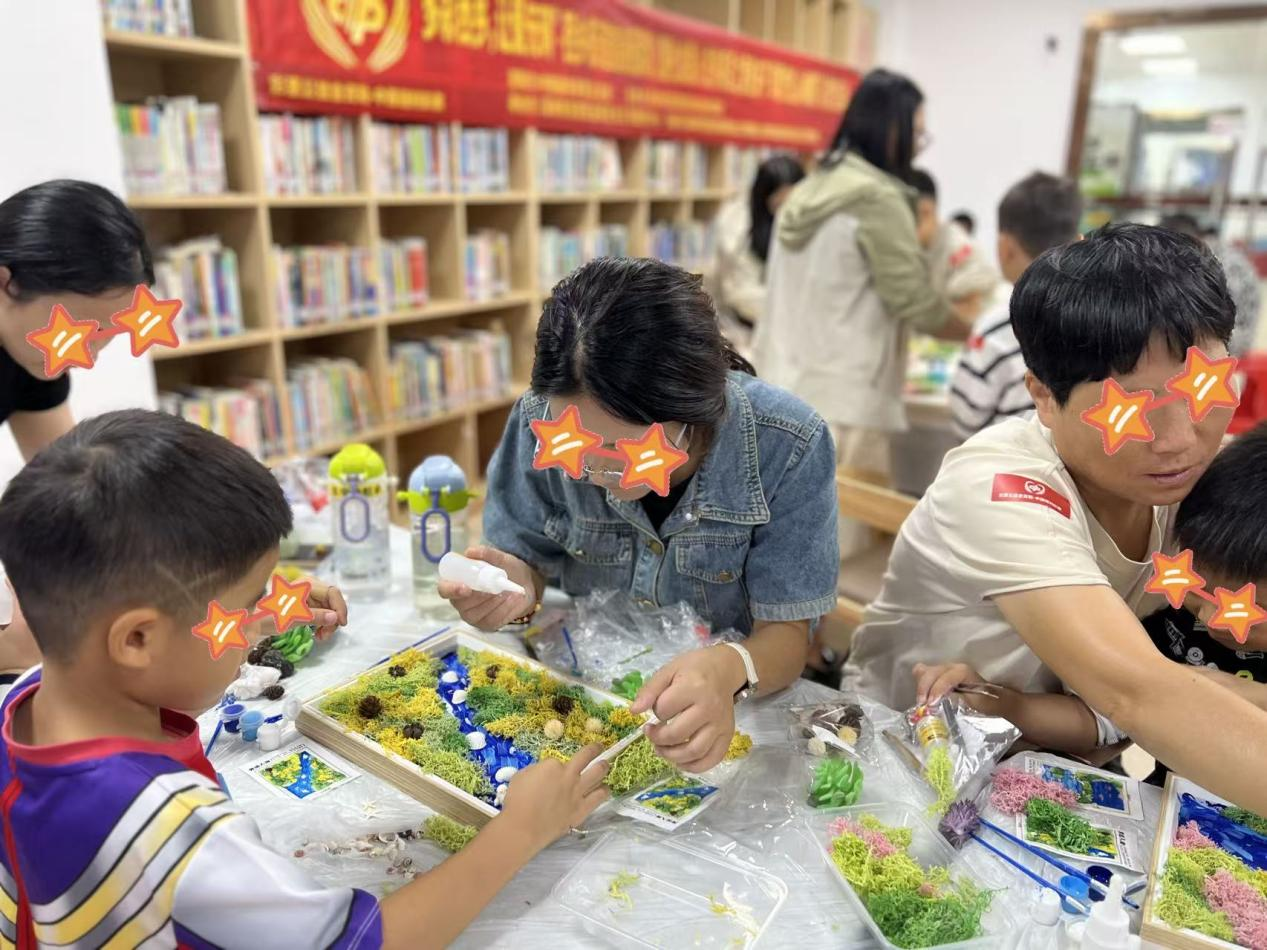 活动伊始,园艺疗愈师介绍了苔藓的生态特性与象征意义。挑选苔藓、设计布局、铺设土壤、点缀装饰……在创作过程中,亲子之间密切配合。家长负责把握整体结构,孩子发挥想象力,用彩砂、蘑菇、玩偶等配件编织故事,方寸画框成为亲子共建的绿色天地。