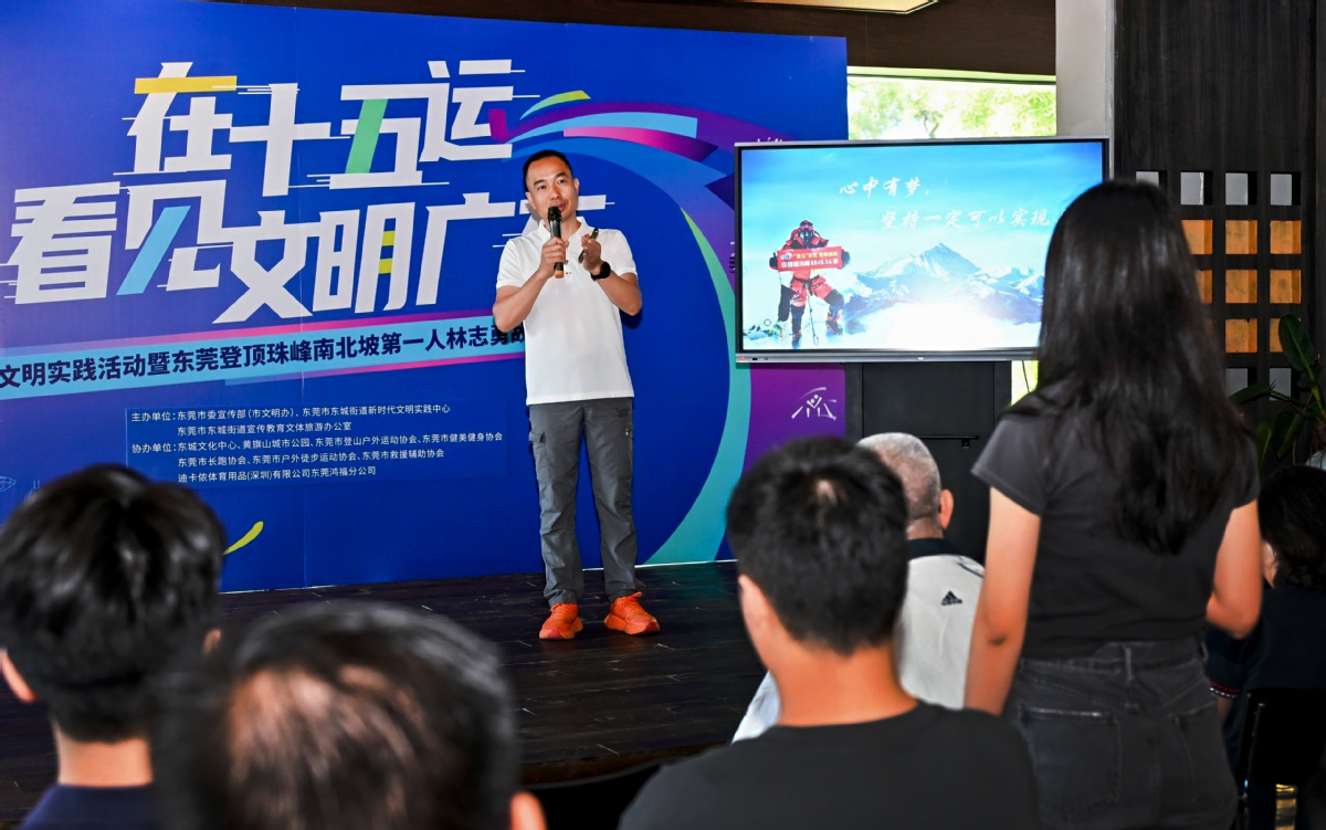 活动尾声,东莞登顶珠峰第一人林志勇带来“在十五运 看见文明广东”主题宣讲。他深情讲述了自己克服向导遇难、感染肺炎、极端天气等多重考验,从南坡再次登顶珠峰,实现南北坡双登顶并将“双万东莞”旗帜展现在世界之巅的壮举。“登顶珠峰需要坚定的信念和顽强的毅力,迎接全运、践行文明同样需要每个人的坚持和付出。”林志勇的分享引发了现场参与者的强烈共鸣,大家纷纷表示深受鼓舞。