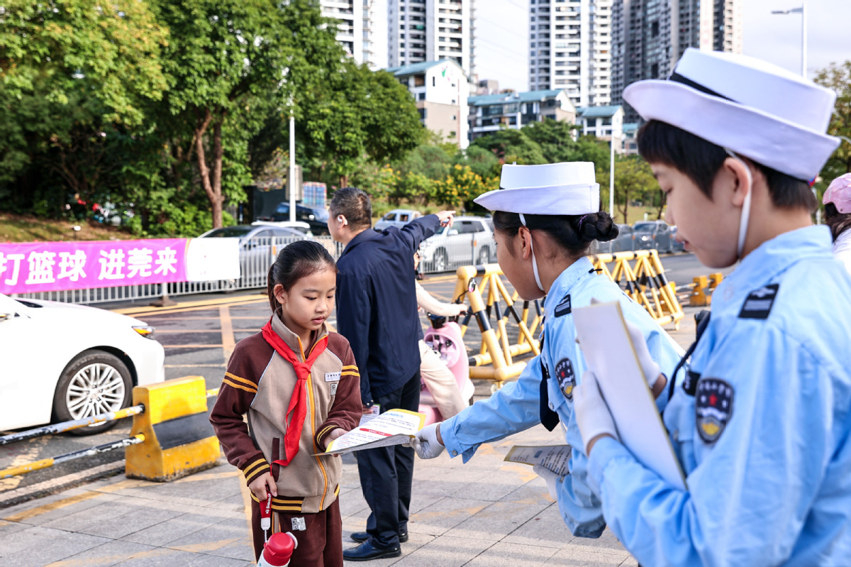 值得一提的是,活动不仅聚焦现场参与者,更将文明触角延伸至校园周边。在虎英小学门口,身着小交警制服的少年交警队员们,在护学人员的带领下,认真开展文明交通宣传与劝导工作。他们向过往家长和同学发放文明出行手册,用稚嫩却坚定的行动传递安全出行的“文明火种”。“穿上这身制服,我就觉得有责任提醒大家遵守交通规则,为迎接全运会出一份力。”参与活动的少年交警赖俊宇眼神坚定地说,他的举动也赢得了不少过往市民的点赞。
