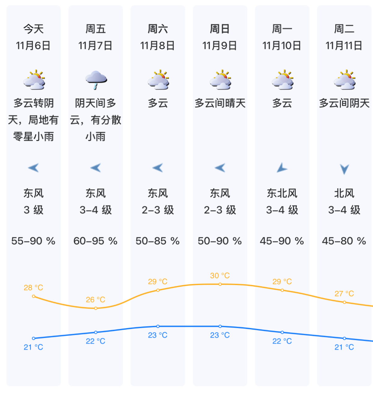 预计11月6日至7日,深圳将以多云到阴天的天气为主,偶有零星小雨,但对出行影响不大。气温将继续回升,6日气温预计在21-28℃之间,体感温暖。