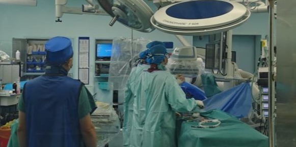 面色苍白、意识模糊、血压骤降——患者被送入抢救室时,腹部已膨隆如鼓,一个巨大的搏动性包块触手可及,这些都是腹主动脉瘤破裂的致命征兆。“启动破裂腹主动脉瘤绿色通道!通知血库紧急备血!麻醉、手术室、介入导管室全员就位!”杨红伟主任的指令瞬间点燃了抢救团队的战斗状态。扩容、升压、快速转运……一场与死神的极速赛跑就此展开。