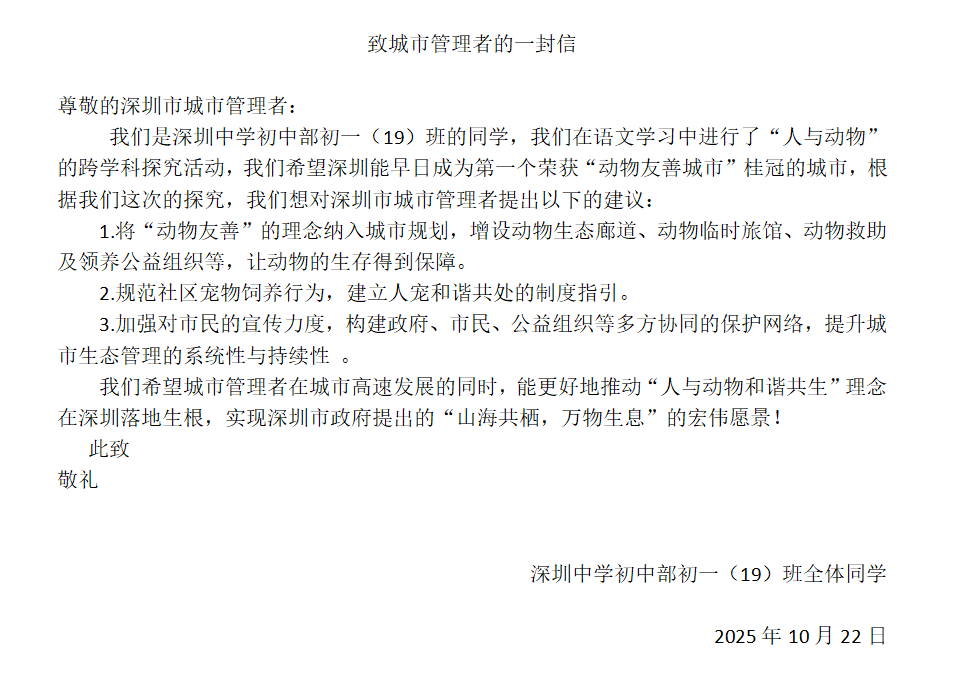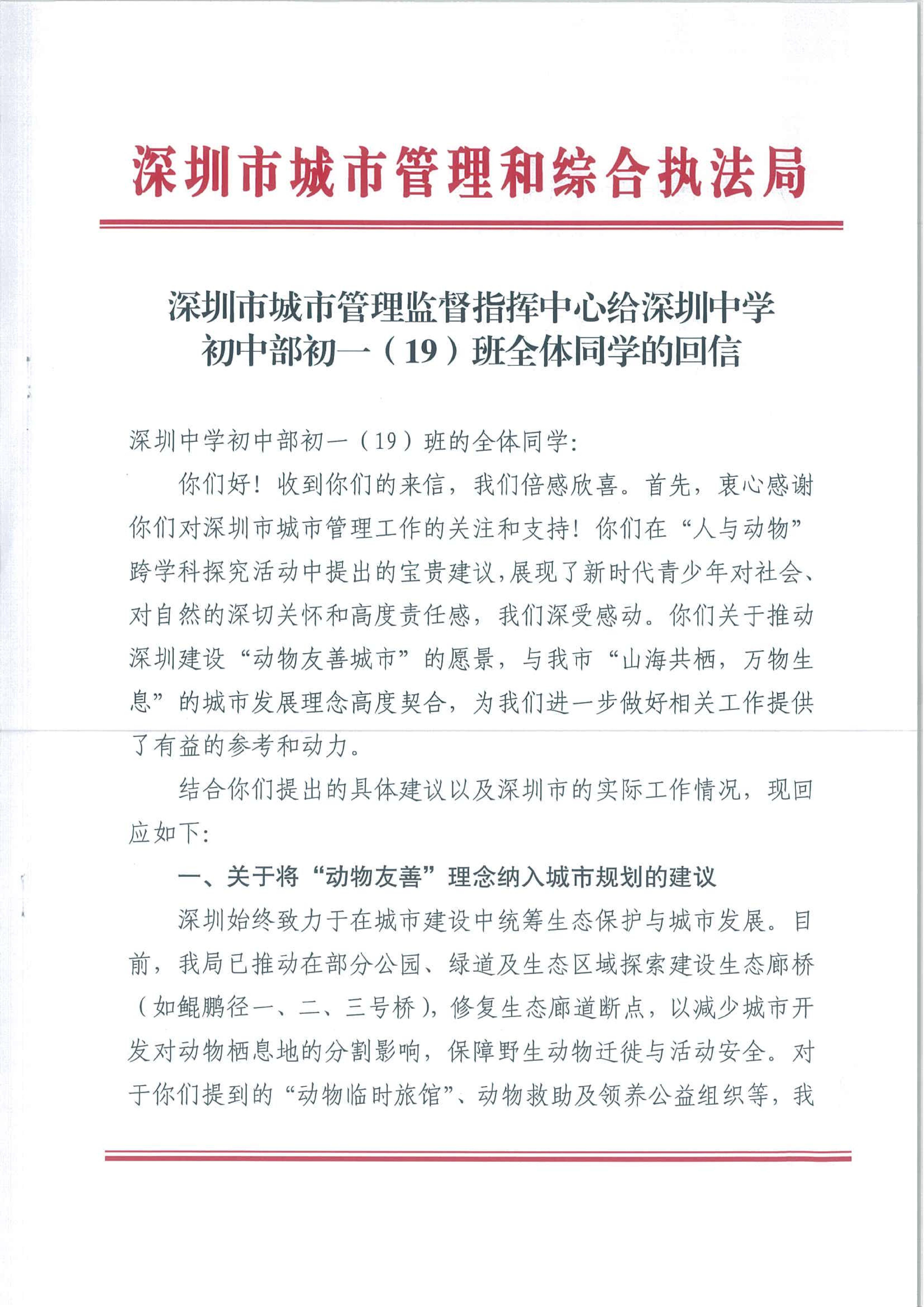 针对这份建议,深圳市城市管理和综合执法局回复了长达三页纸的信函,信中不仅充分肯定了学生的建设性意见,更明确表示将积极研究采纳动物友善理念,并鼓励大家继续以“城市小管家”身份共同参与城市建设。