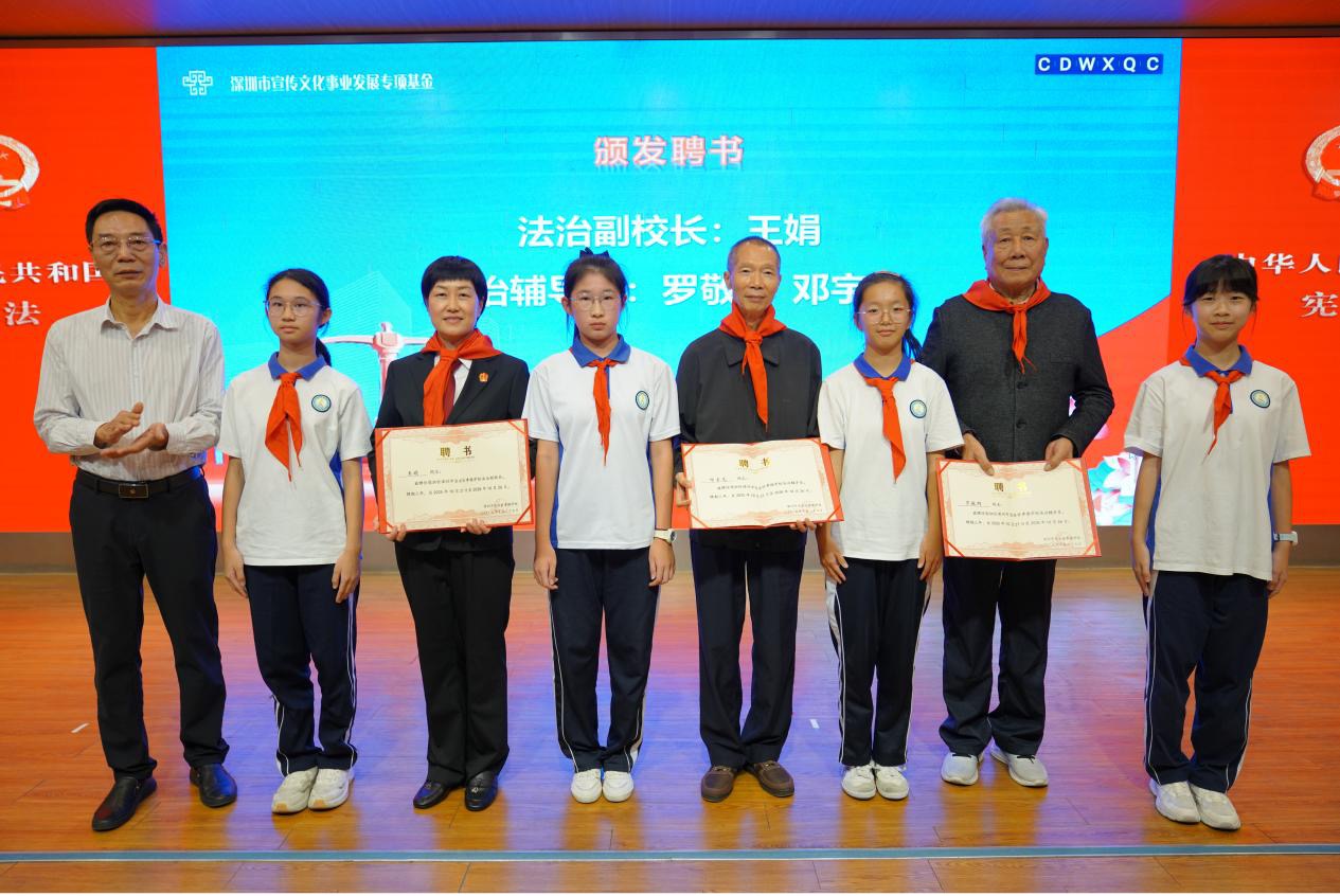随后,孝德学校举行了法治副校长及法治辅导员聘任仪式。学校聘请宝安区法院研究室副主任、一级法官王娟担任法治副校长,同时聘请深圳市中级人民法院原副院长罗敬群、原机关党委书记邓宇光担任法治辅导员,进一步夯实校院合作机制,为学校法治教育工作注入专业力量。
