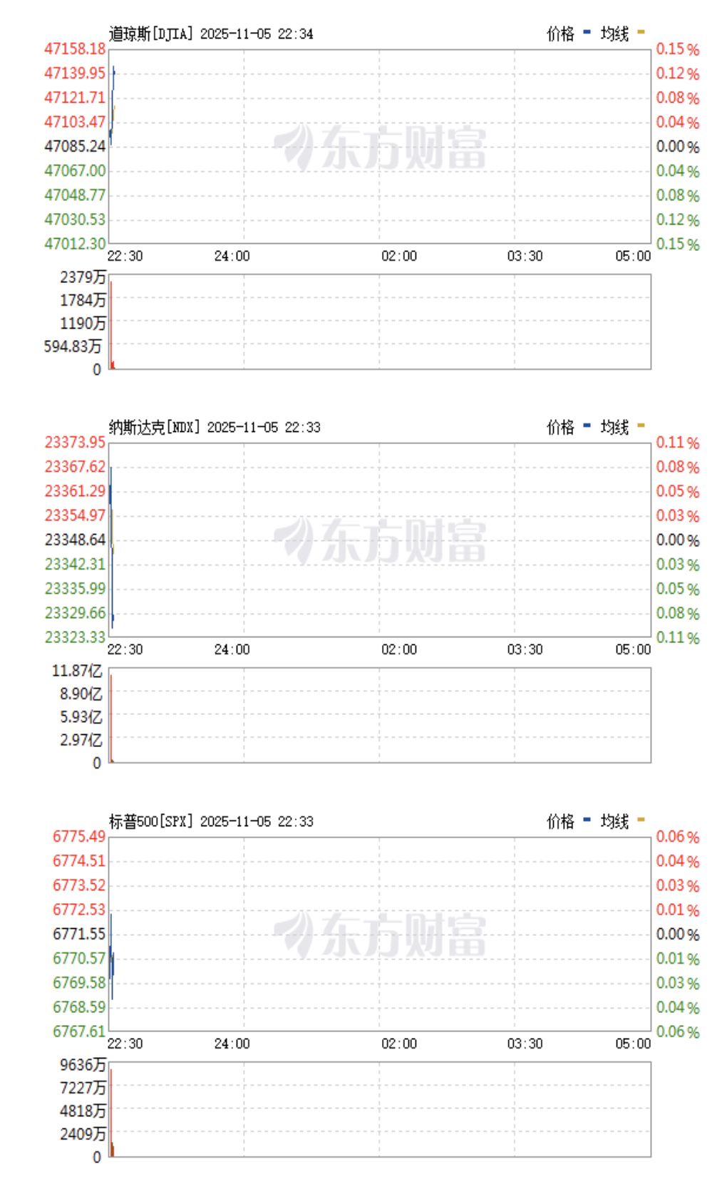 11月5日,美股三大指数开盘涨跌互现,道琼斯指数跌0.01%,标普500指数跌0.04%,纳斯达克综合指数涨0.06%。