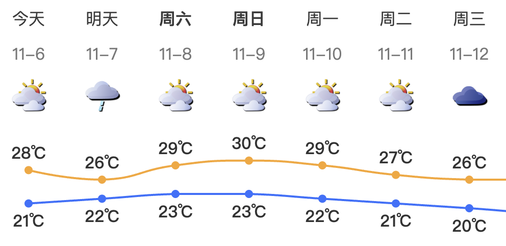 【今日天气】多云转阴天,局地有零星小雨;气温21-28℃;东风3级,沿海、高地和海区阵风6-7级;相对湿度55%-90%。