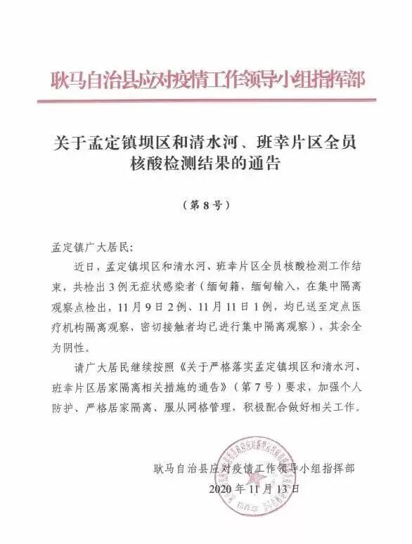 11月13日上午,耿马县应对疫情工作领导小组指挥部通报了孟定镇坝区和清水河、班幸片区全员核酸检测结果。
