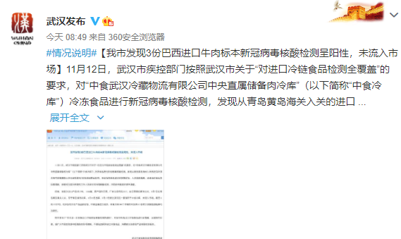 据武汉市卫健委通报,12日,武汉市疾控部门按照武汉市关于“对进口冷链食品检测全覆盖”的要求,对“中食武汉冷藏物流有限公司中央直属储备肉冷库”冷冻食品进行新冠病毒核酸检测,发现从青岛黄岛海关入关的进口冷冻去骨牛肉臀腰肉心外包装样本有3份检测结果呈阳性。