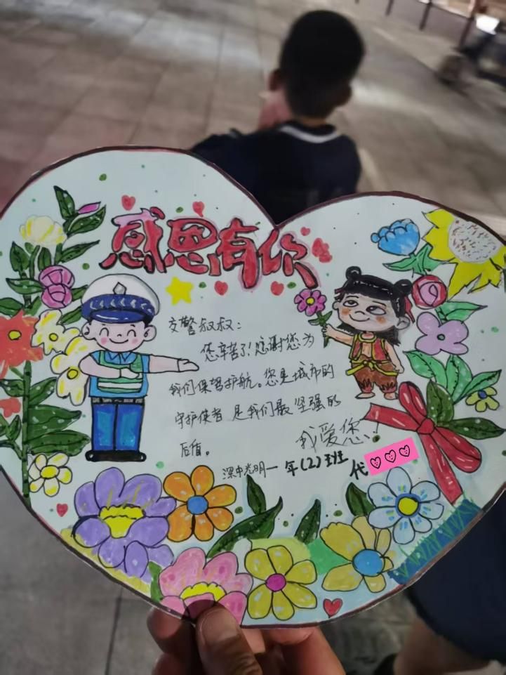 孩子父亲笑着解释,学校布置的感恩贺卡任务,让孩子始终惦记着要亲手送给守护校园周边的交警叔叔。
