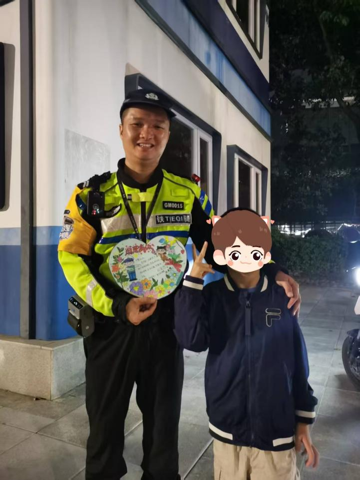 夜色中的光明光侨路口,荧光绿的身影始终坚守在车流之间。10月31日晚高峰,光明大队玉塘中队铁骑队员陈武彪执勤时,迎来了一位特殊的“来访者”——六七岁的小男孩手捧着爱心画卡,红扑扑的脸蛋上满是认真,将这幅画有微笑交警、写满感谢话语的作品郑重递出。