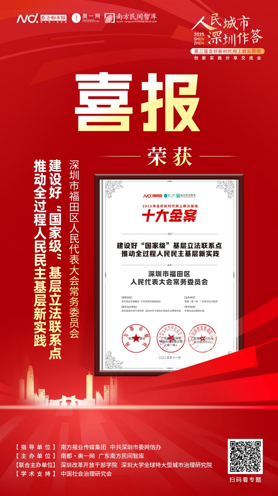 人民城市,深圳作答。11月5日,在“2025第三届走好新时代网上群众路线创新实践分享交流会”上,深圳市福田区人大常委会“建设好‘国家级’基层立法联系点,推动全过程人民民主基层新实践”案例荣获2025年走好新时代网上群众路线“十大金案”。