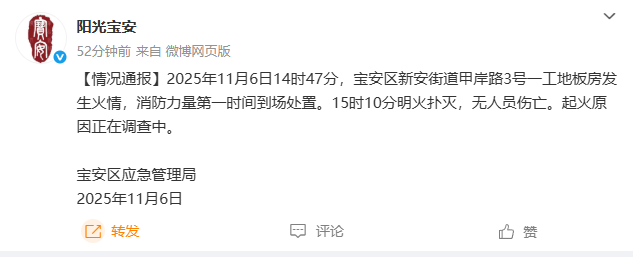 当天下午,宝安区应急管理局在微博发布通报表示,2025年11月6日14时47分,宝安区新安街道甲岸路3号一工地板房发生火情,消防力量第一时间到场处置。15时10分明火扑灭,无人员伤亡。起火原因正在调查中。