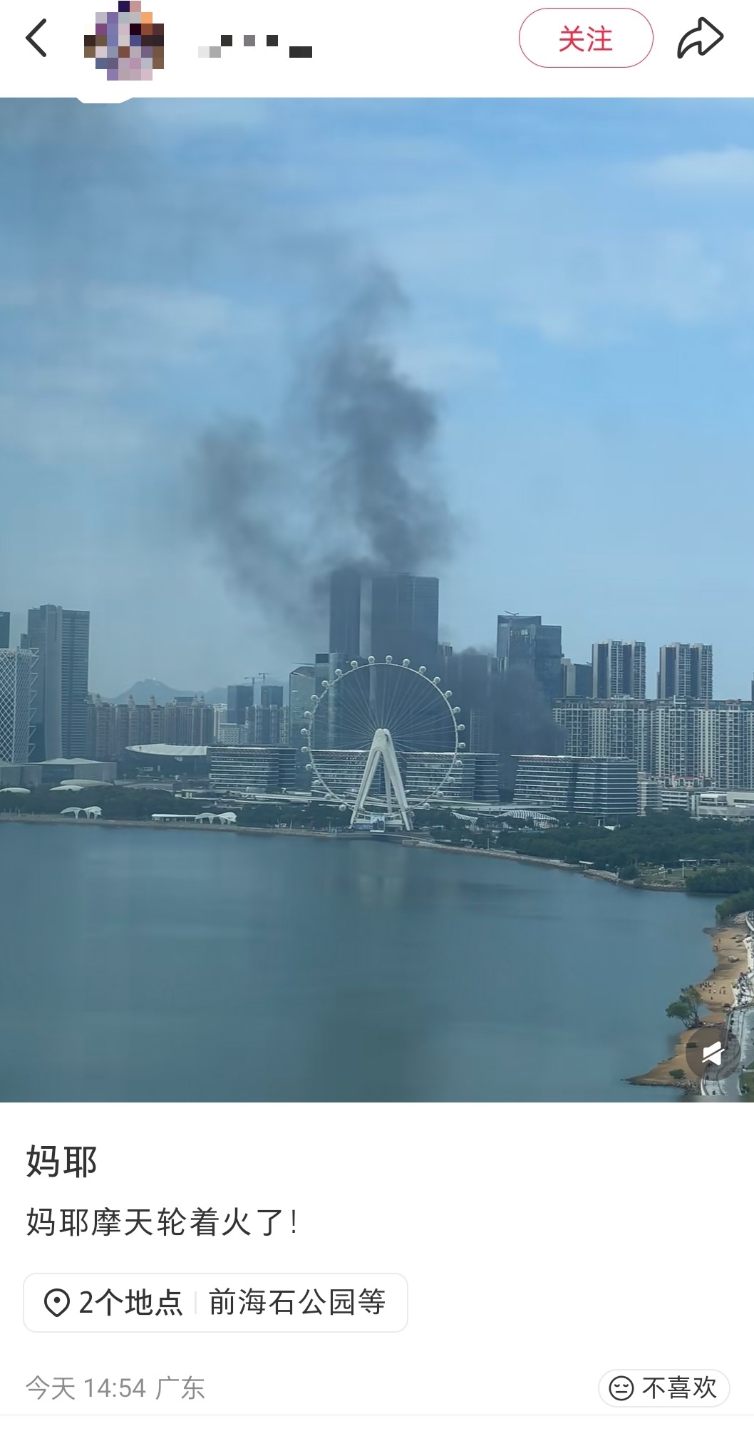 11月6日下午,有网友在社交平台发消息称“摩天轮着火了”,地点定位在深圳市宝安区前海石公园和欢乐港湾处,并附有摩天轮所在位置冒出黑烟的照片。