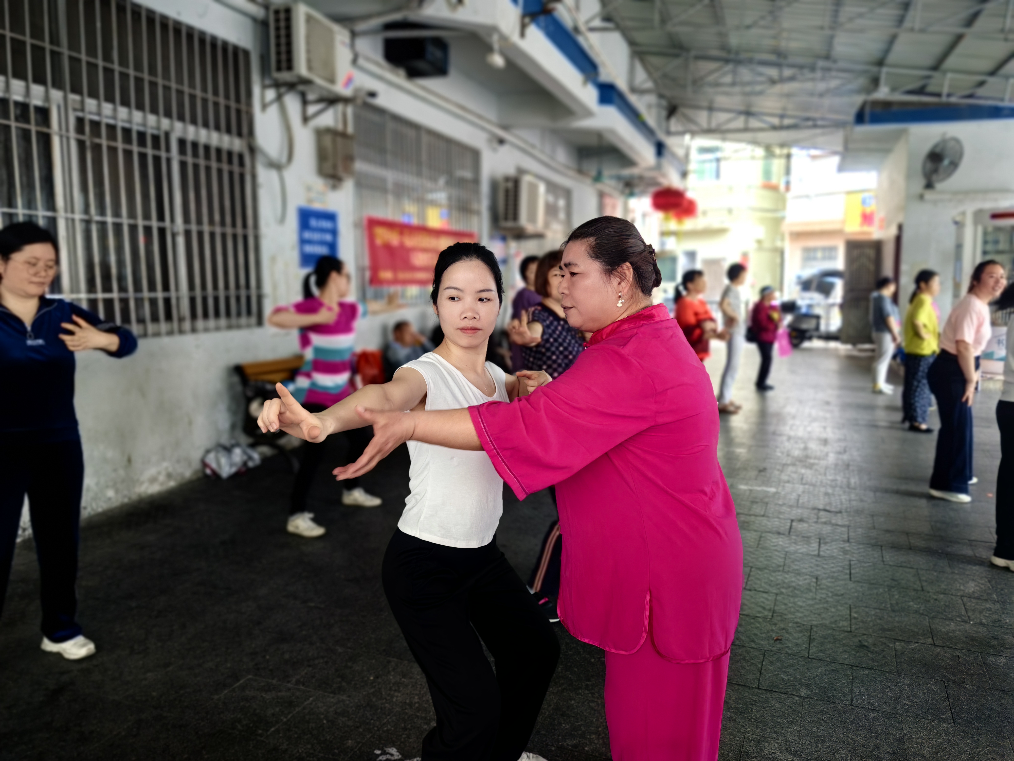 八段锦学习工作坊实现了“室内教学+室外展示”的有机融合。社区将党群服务中心大院篮球场设为教学基地,邀请社区能人陈丽萍老师开展5节系统教学课程;活动后期,社区对接龟山公园资源,在山顶平台举办成果展示活动,21名学员整齐划一的演练赢得居民纷纷赞扬。这一过程不仅让妇女变身“文化传播者”,更为社区后续开展老年八段锦课程奠定基础,形成服务闭环。