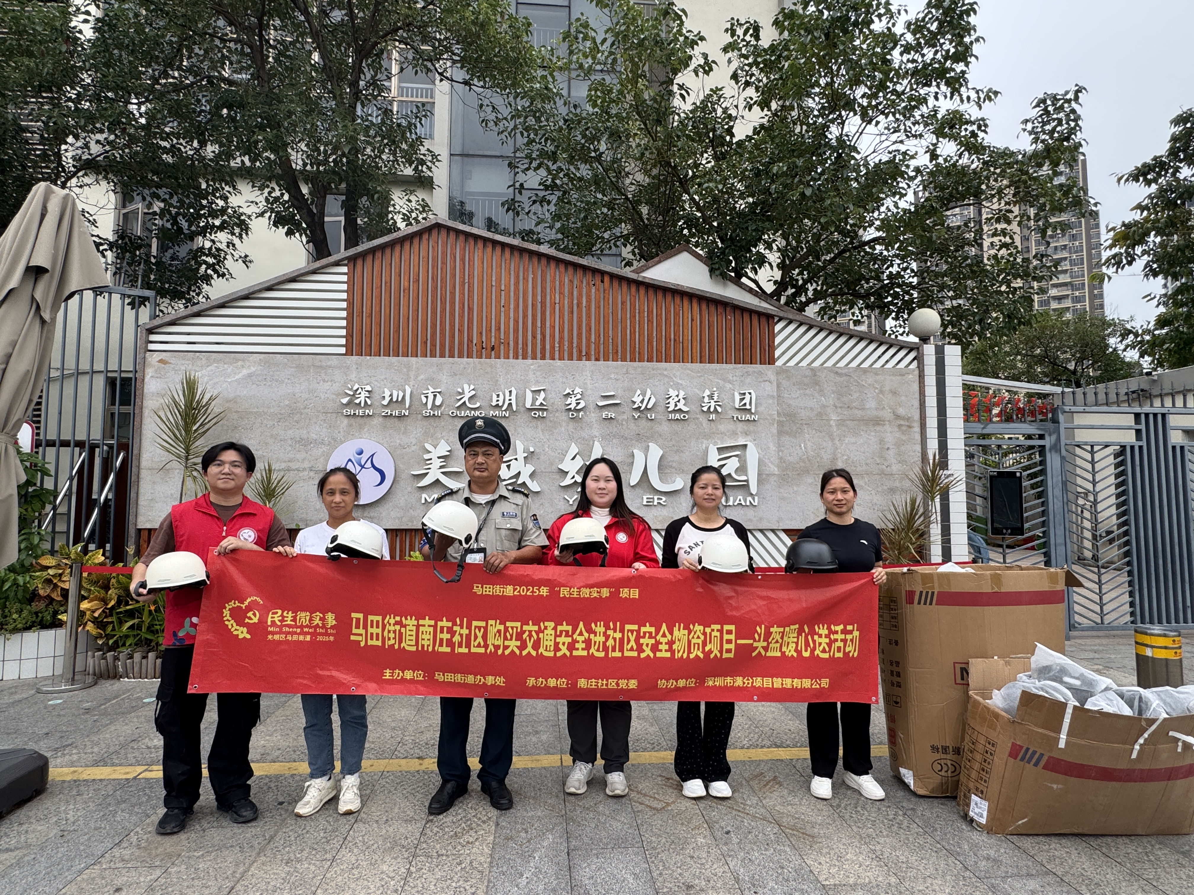 近日,马田街道南庄社区以“送头盔,护平安”为主题的民生微实事活动温暖落地。社区党委带队联合社工,走进辖区内三所幼儿园,将精心准备的安全防护头盔直接送到幼教工作者手中,以“微实事”撬动“大民生”,赢得了教职工们的广泛赞誉。