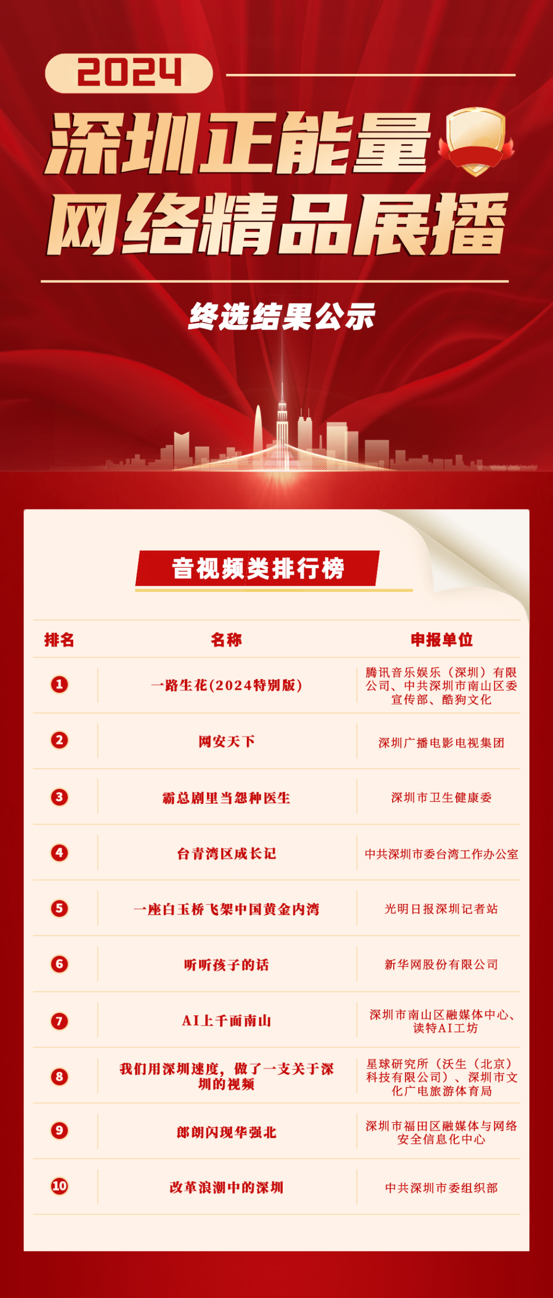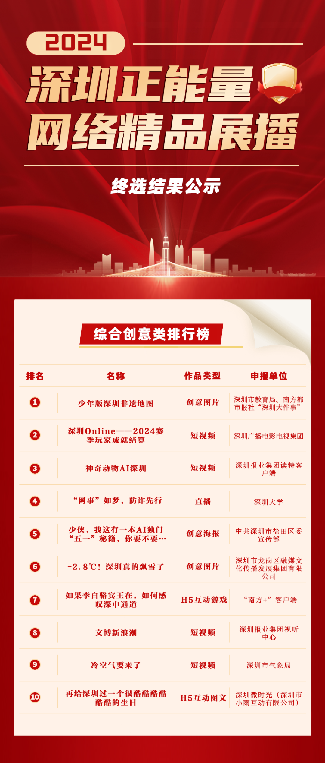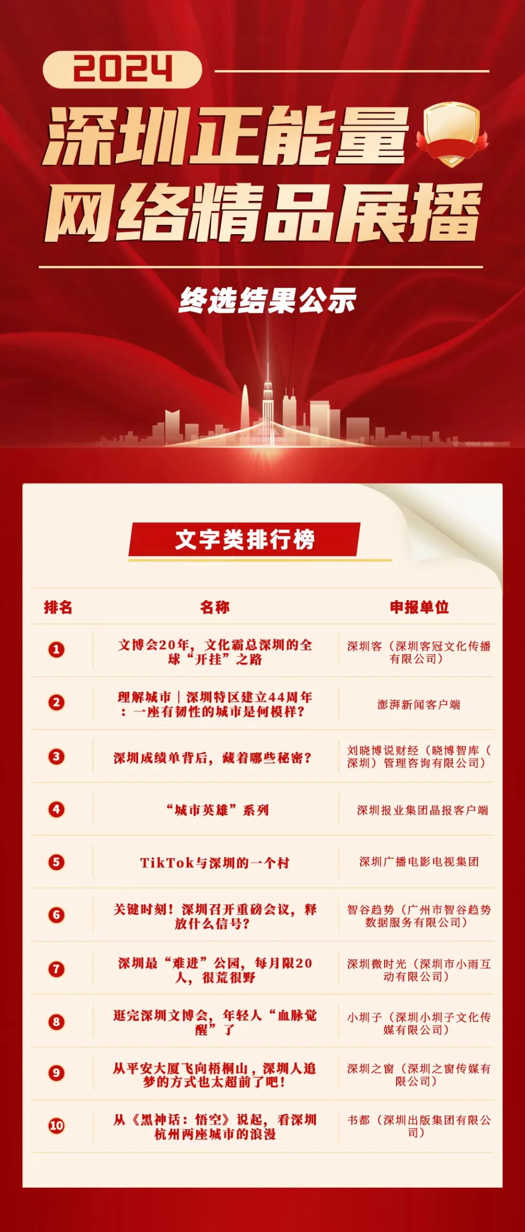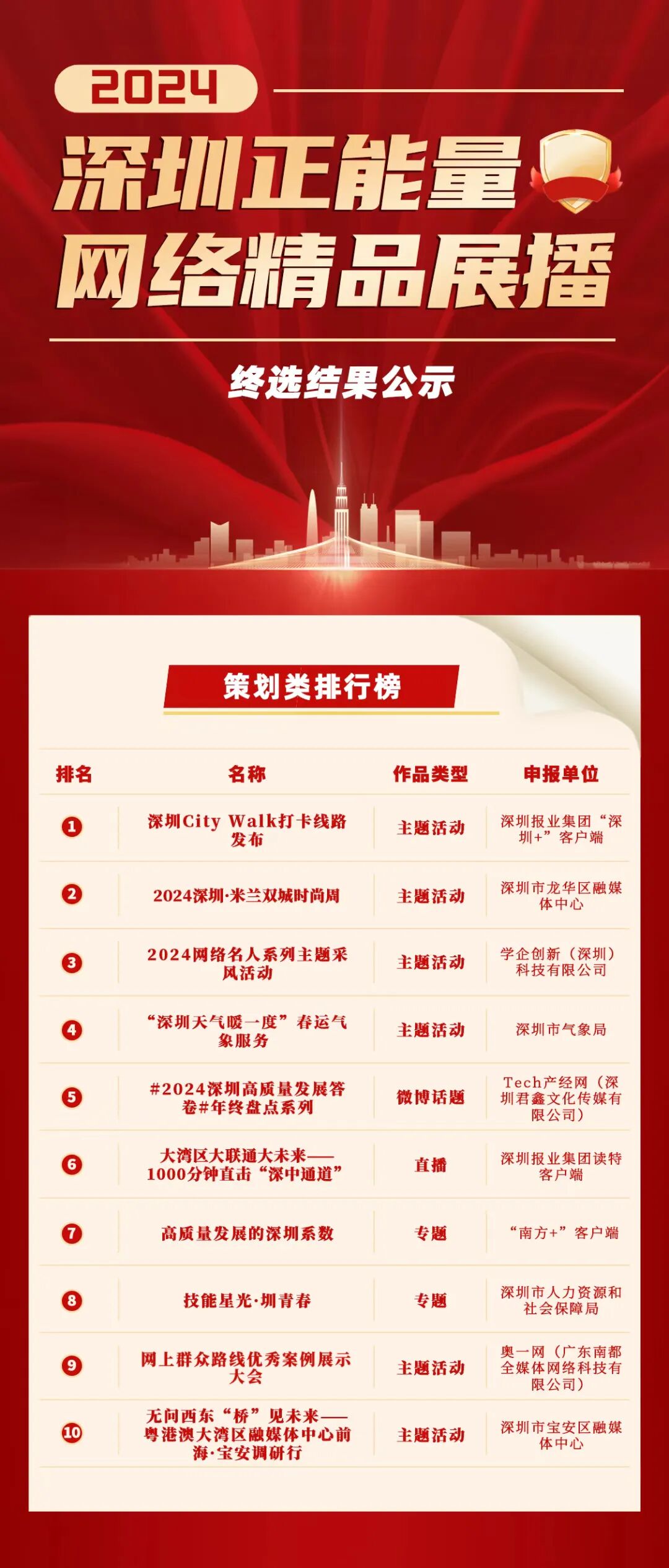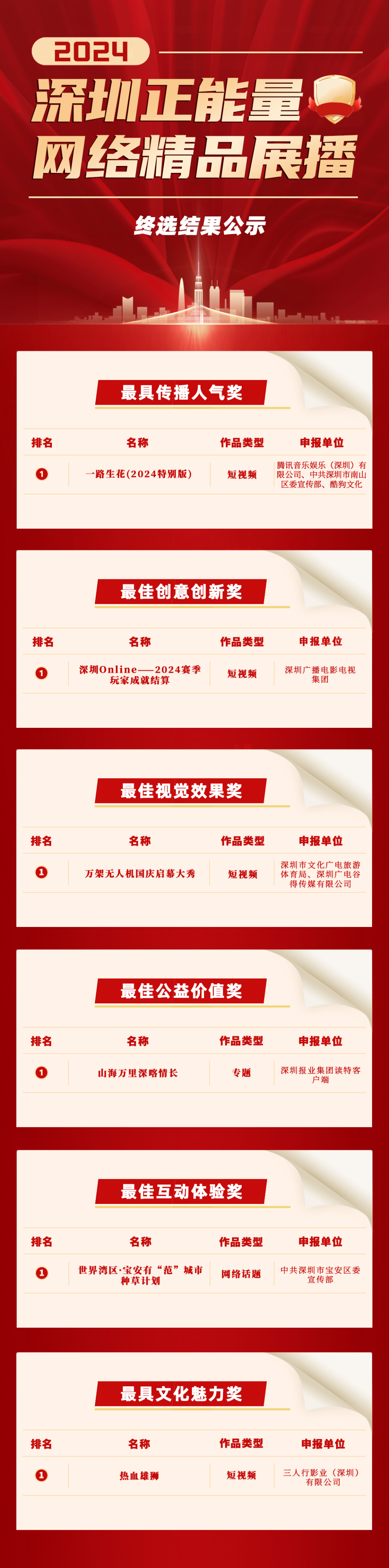 由深圳市委网信办主办的2024深圳正能量网络精品展播活动自启动以来,经过征集、初筛、网络投票、专家评议等环节,共评出五大类(策划类、文字类、图片类、音视频类、综合创意类)“十佳”优秀作品,六大单项最佳作品(最具传播人气作品、最佳创意创新作品、最佳视觉效果作品、最佳公益价值作品、最佳互动体验作品、最具文化魅力作品)以及二十个优秀作品,最终结果以揭晓为准。