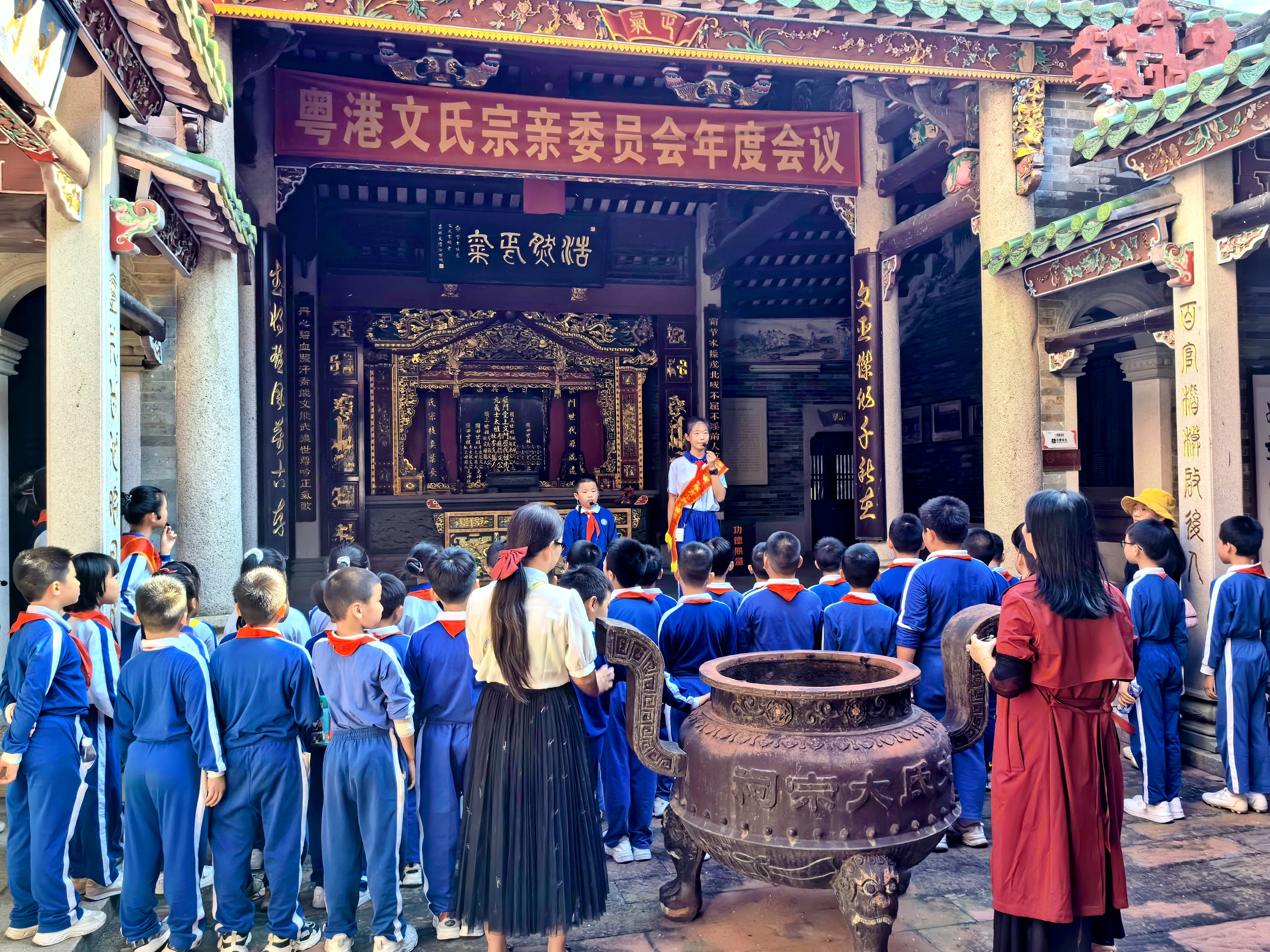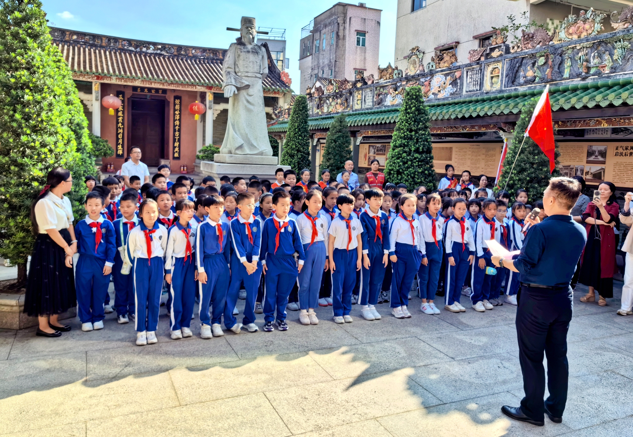 11月5日下午,宝安区松岗街道东方社区文氏大宗祠(文天祥纪念馆)广场上,110余名佩戴红领巾的东方小学学生齐声诵读《正气歌》。这场以“浩然正气涤童心,一片丹心照汗青”为主题的活动,由东方社区党委与东方小学联合主办,通过沉浸式体验让学生在缅怀文天祥的过程中厚植爱国情怀。