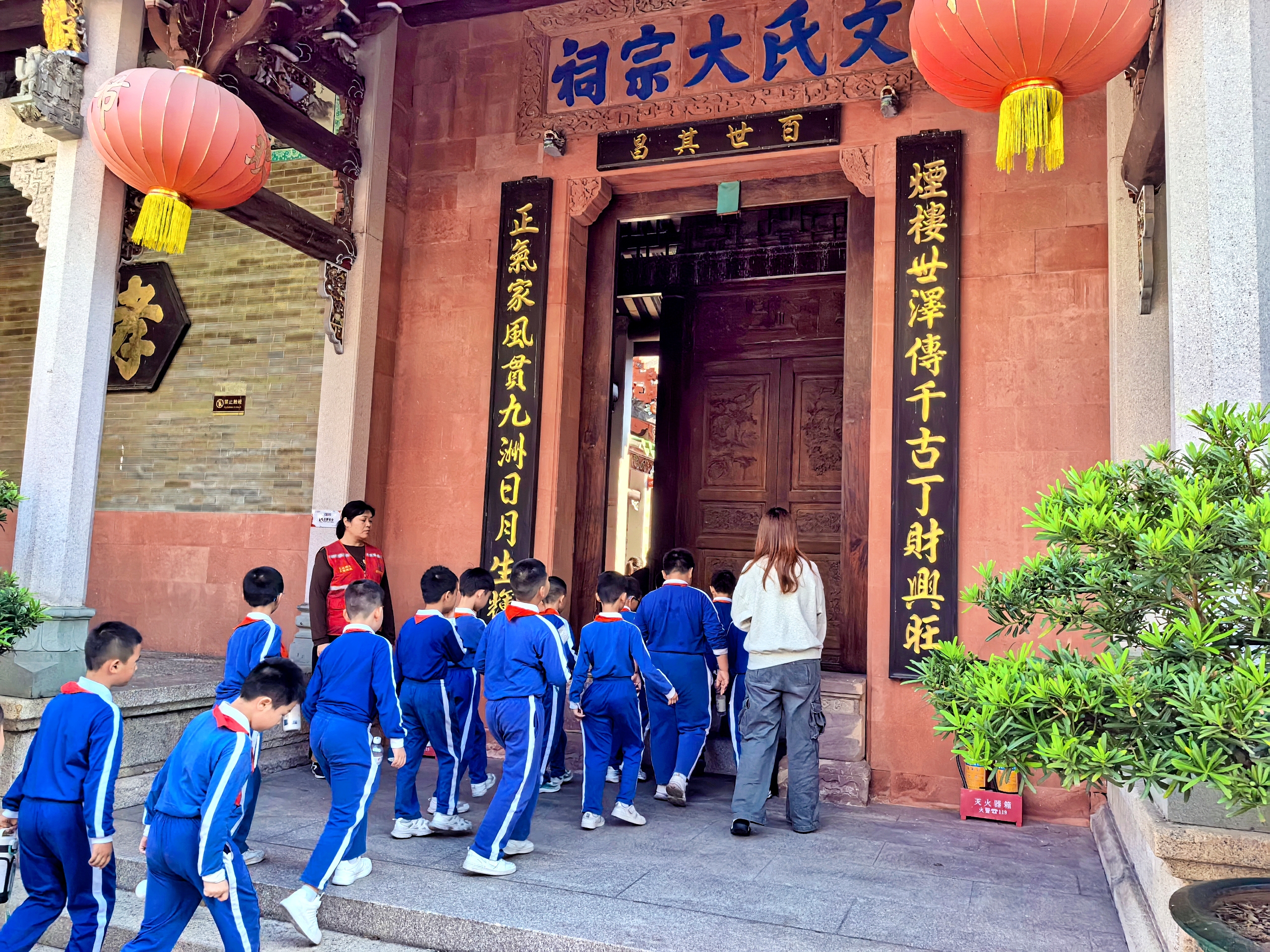 活动以感悟爱国正气为主线,在社区工作人员、志愿者和老师的协同下,由8名小小解说员带队开启学习之旅。从宗祠门口抗元浮雕与“宋廷柱石,文庙馨香”对联的解读,到广场上文天祥雕像与生平的介绍,再到文化长廊中读书报国、被俘不屈故事与《过零丁洋》诗句的深度融合,每一处场景都让学生近距离触摸历史,感受先贤的人格魅力。